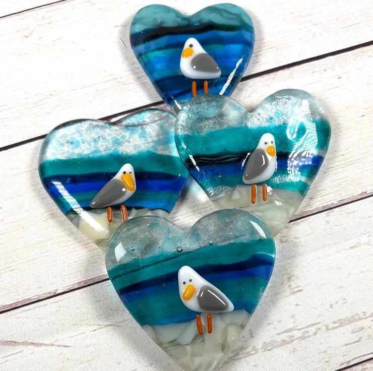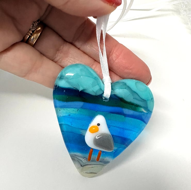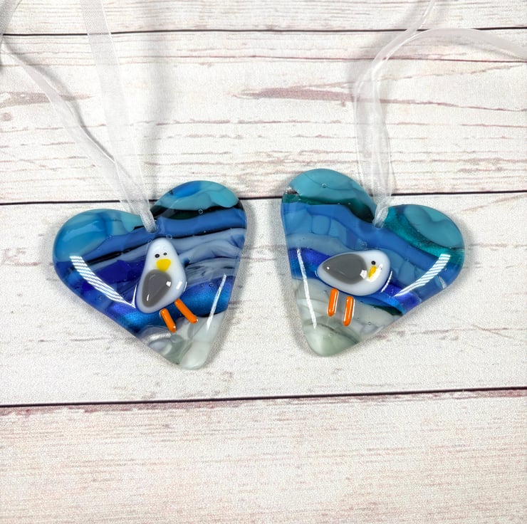 Gorgeous fused glass hearts with seagull . Sea themed heart with the addition of a rather cute seagull. Each hanging heart is approximately 3.5 inch in diameter , drilled and strung with white ribbon . The hearts are created using a cast method first in my kiln then a tiny handmade seagull is added . They make wonderful small gifts for those that love anything to do with the sea including seagulls.