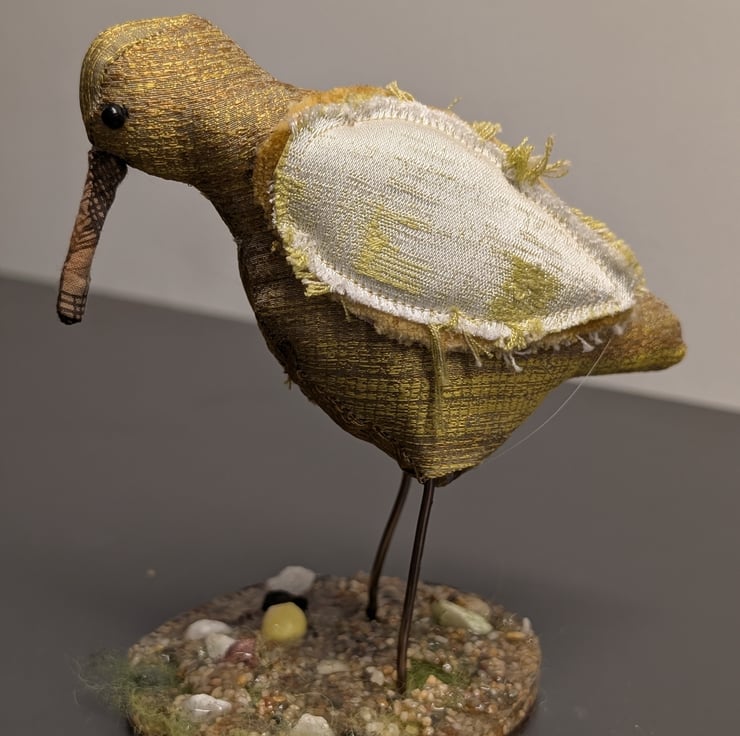 Quirky wading bird fabric sculpture hand crafted from reclaimed fabric and other recycled materials. Inspired by the bird life of the Tamar Valley. Set in a resin base. Approx 15cm height.