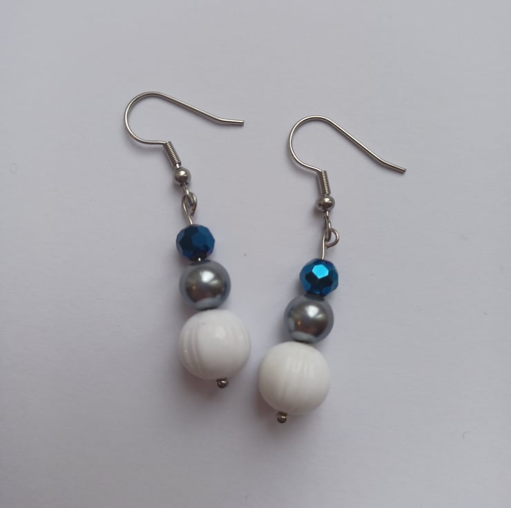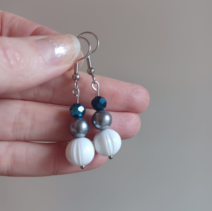 A pair of handmade drop earrings featuring a White bead, grey pearl bead and a peacock blue bead. Perfect for jazzing up your daytime look or accentuating an evening outfit!