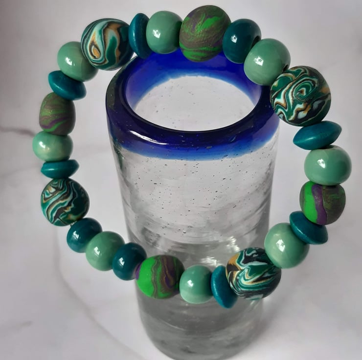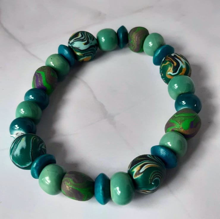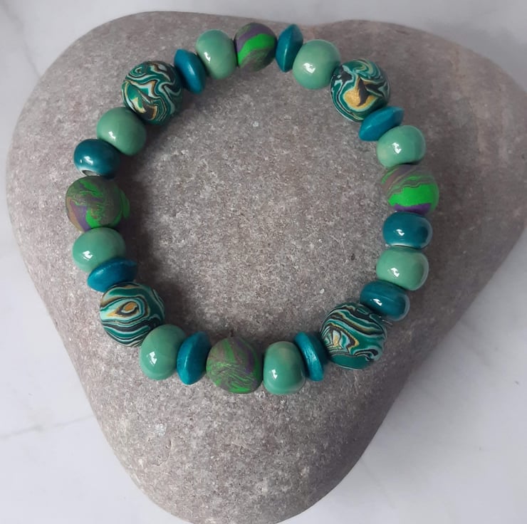 Handmade bracelet featuring polymer clay beads in a beautiful mix aqua shades, with subtle hints of gold, green and purple. Each bead is individually crafted, making every bracelet truly one of a kind.