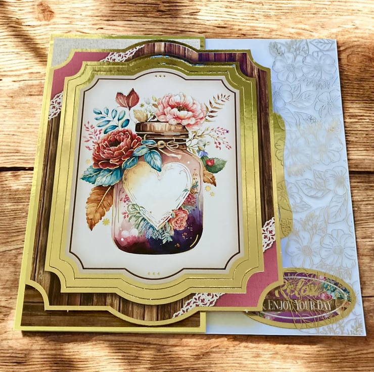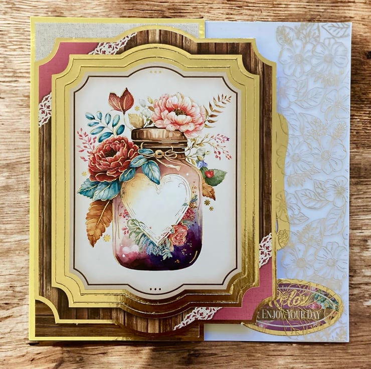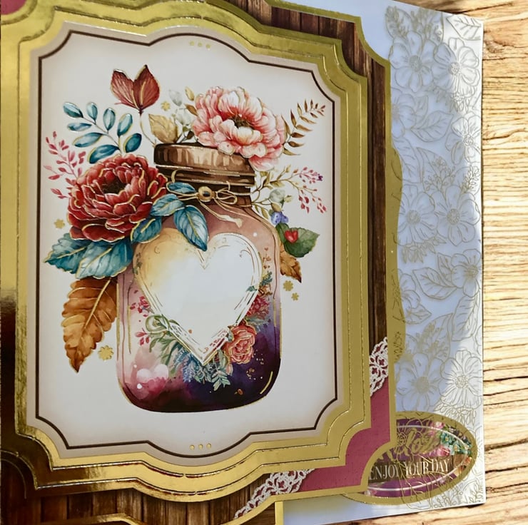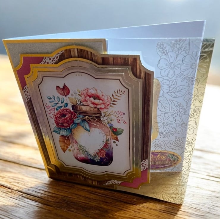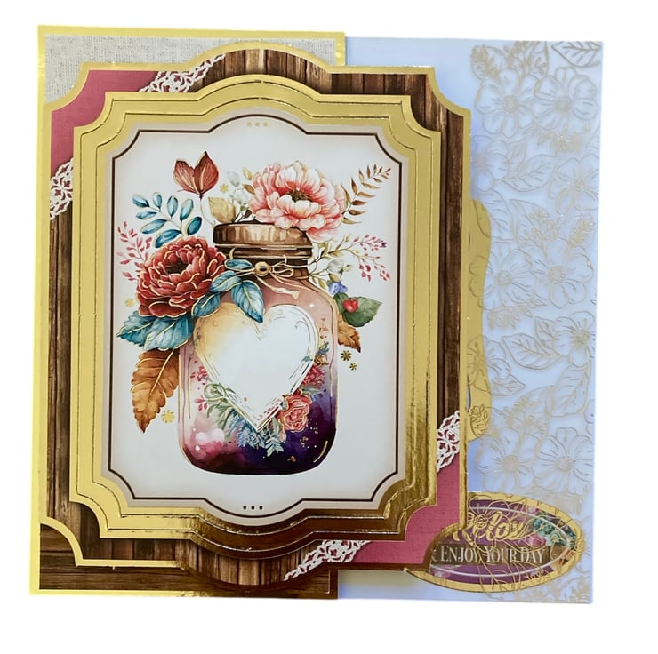 This handcrafted Mother’s Day card is full of warm, rustic charm and heartfelt love. The front features a beautifully layered design with a vintage-style mason jar bursting with florals and a soft heart centrepiece — like a little jar filled with appreciation just for Mum.