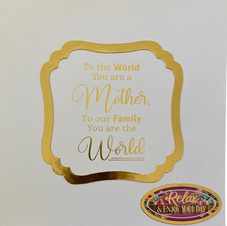 “To the World You are a Mother, To our Family You are the World” and the sentiment “Relax and Enjoy Your Day”.