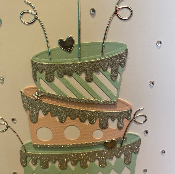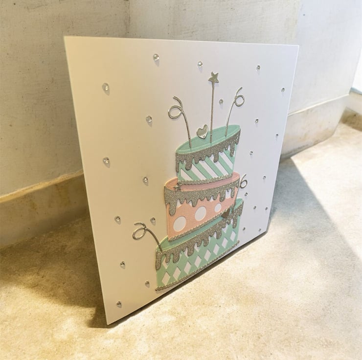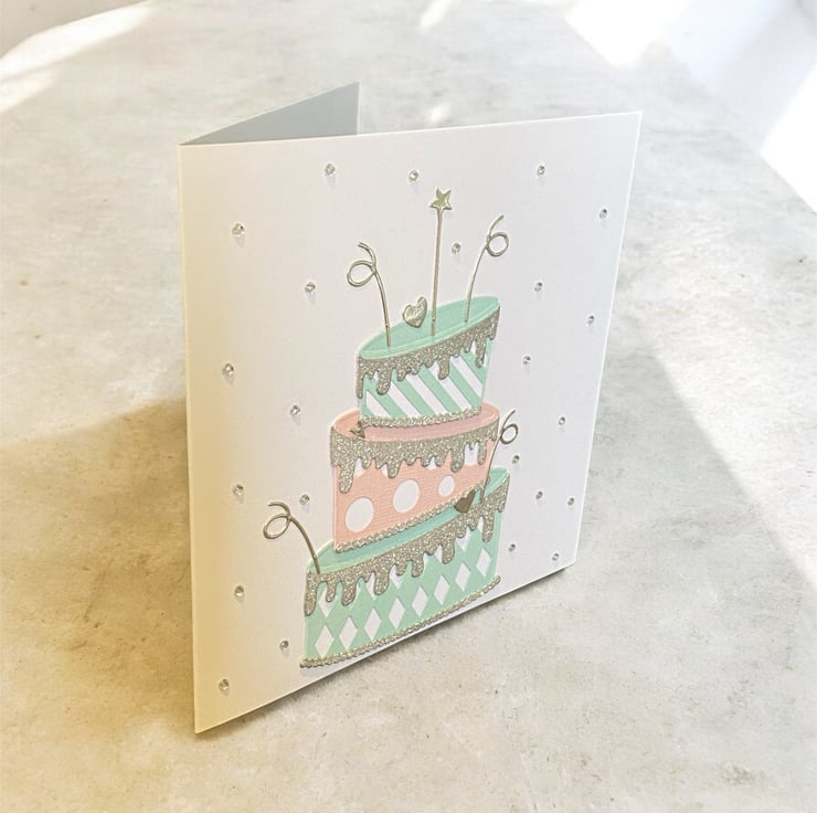 Celebrate in style with this joyful handmade birthday card featuring a whimsical three-tiered cake, lovingly crafted using die cutting techniques. Each layer of the wonky cake is built from premium pink and mint cardstock, adorned with playful patterns and finished with shimmering silver sparkles for a festive touch.