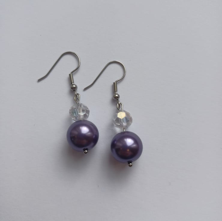 A pair of handmade drop earrings featuring a purple pearl bead and a crystal bead. Perfect for jazzing up your daytime look or accentuating an evening outfit!
