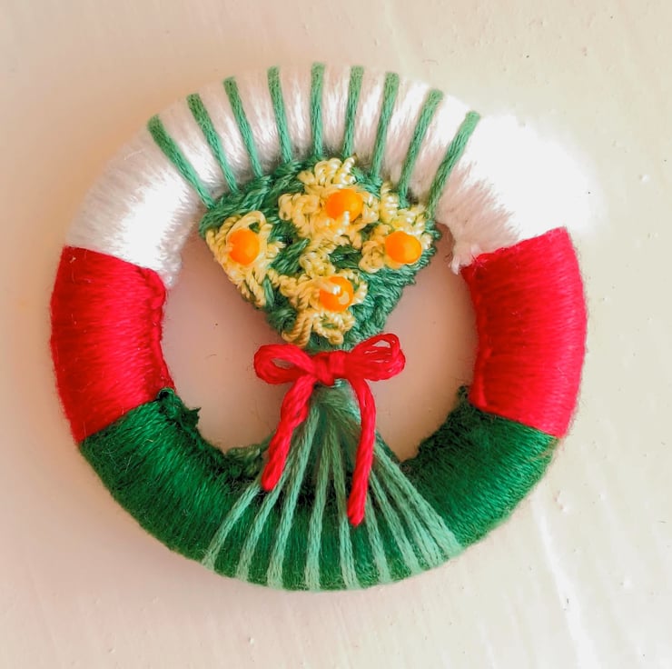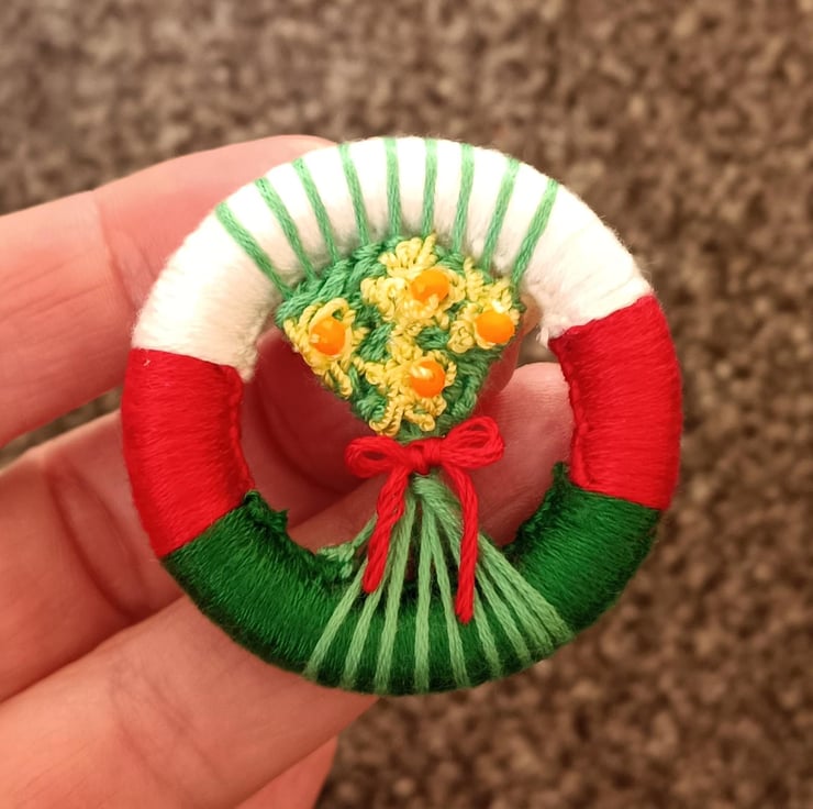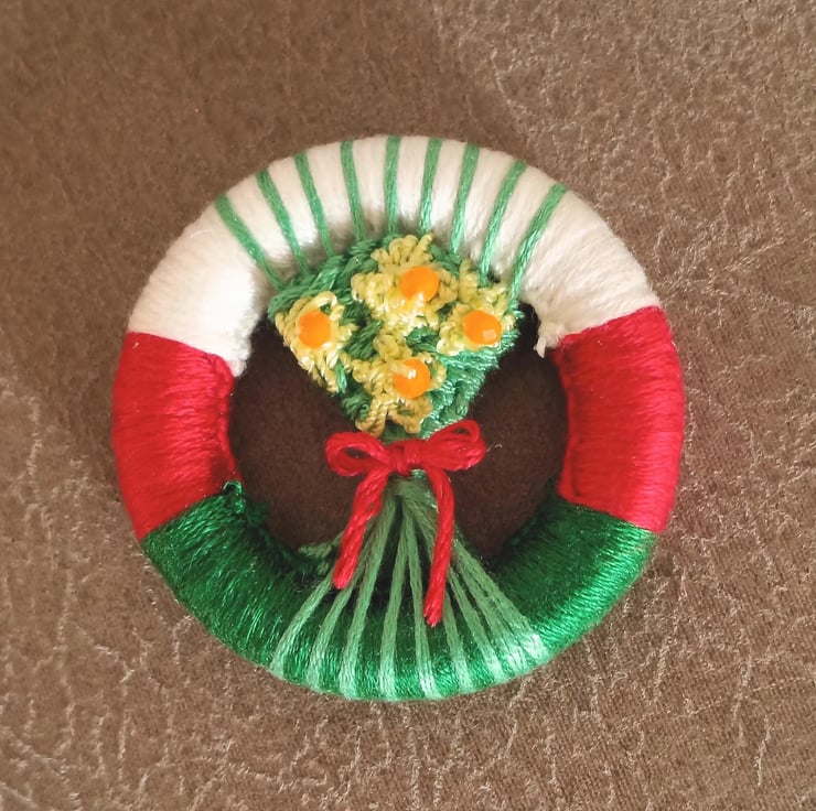 This unusual hand woven brooch, is designed in the traditional Dorset button style, to represent the colours of the Welsh flag with a bunch of embroidered daffodils to the center. The daffodil being the national flower of Wales and worn on March 1st every year for St David's Day/ Dydd Gwyl Dewi Sant.