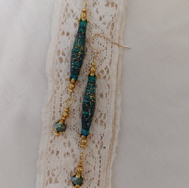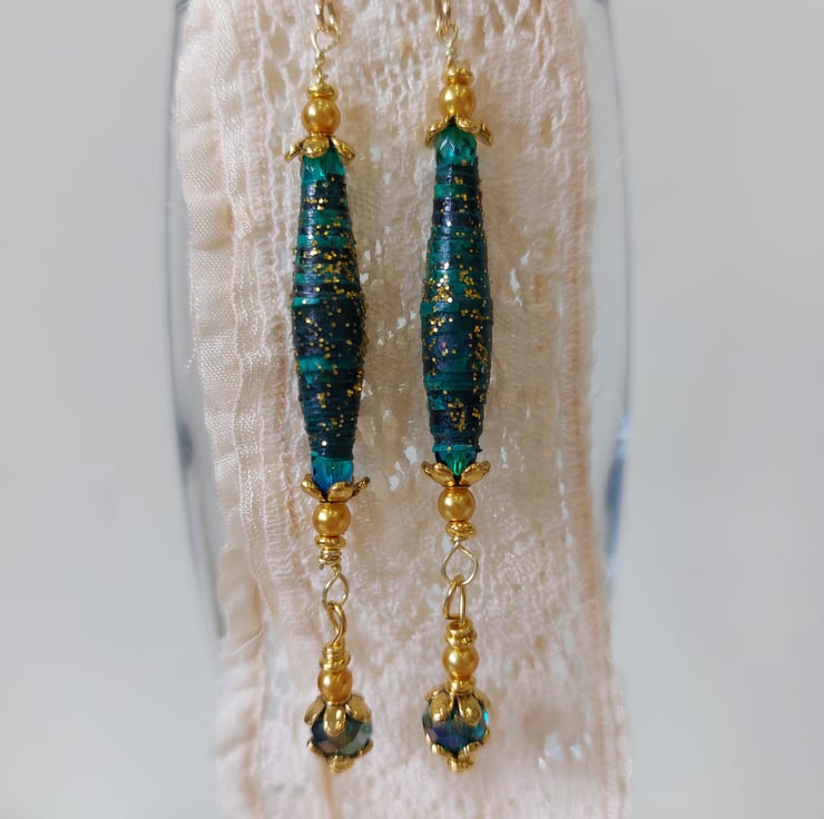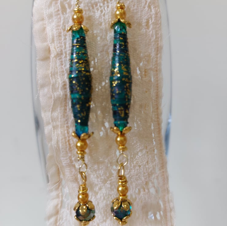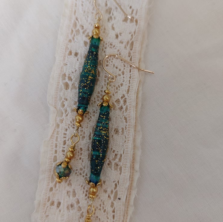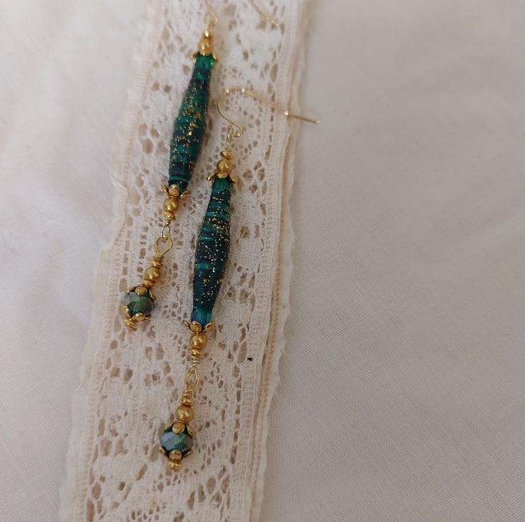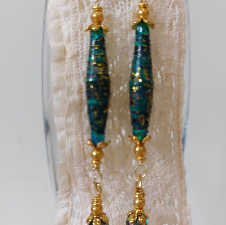 Pair of Drop earrings featuring a boho long paper bead made from old magazine pages, green glass crystals and gold plated beads. 3 inches long and suspended on gold plated nickel free hooks. Presented tissue wrapped in an organza bag.