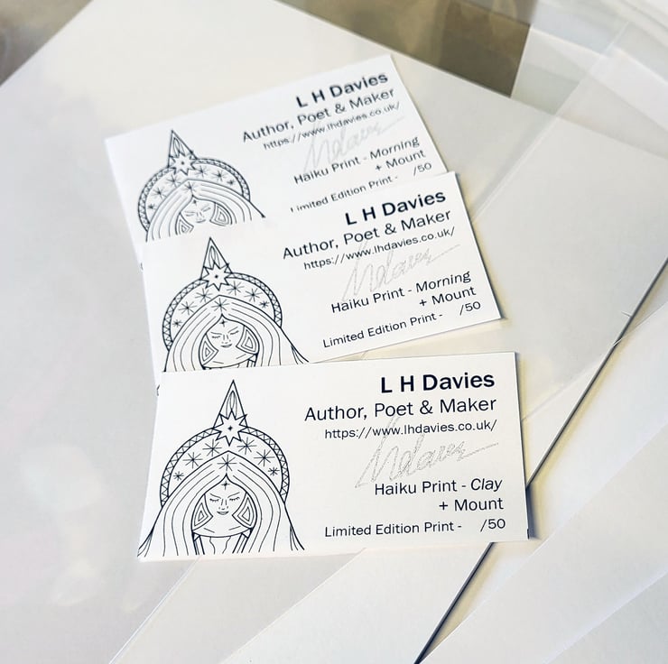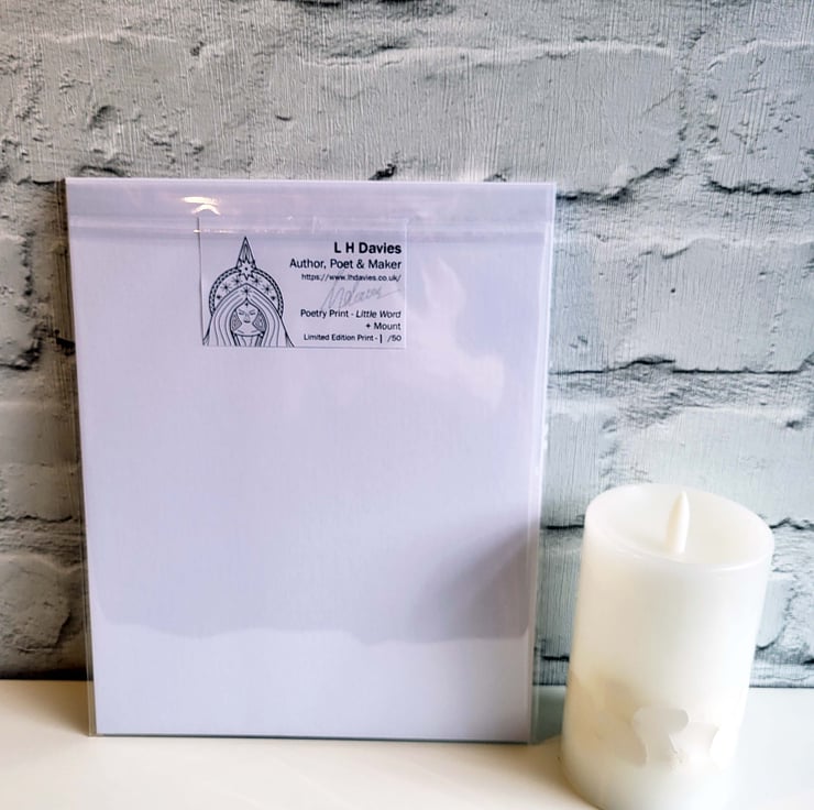 I am a poet/writer and a maker/artist so I have combined these to create limited edition poetical art prints that are printed digitally. Only 50, in this option, are available and each comes with a label stating the edition number.