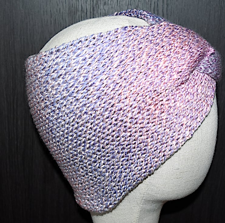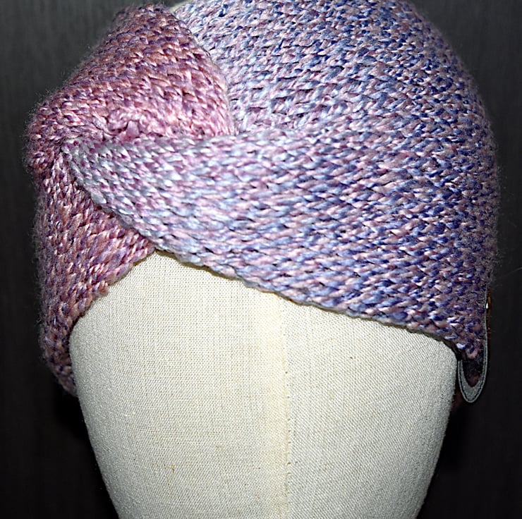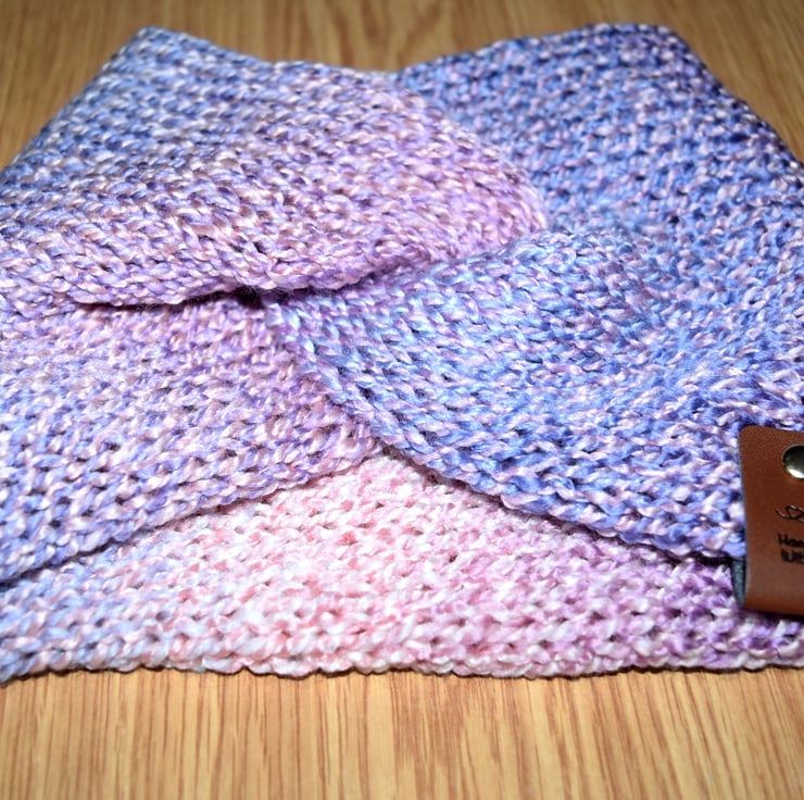 A blend of pinks & purples in this colour called pastel marble. Not only is this twisted head wrap stylist, but it also keeps your ears warm in the colder weather. Your can bring your ponytail out of the top.