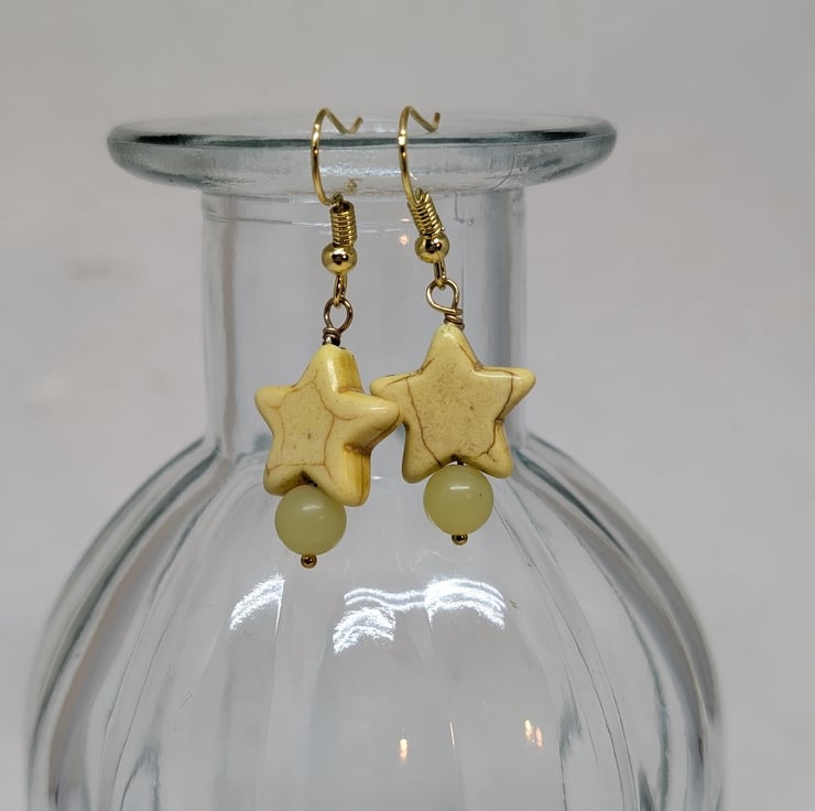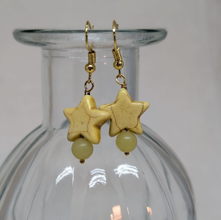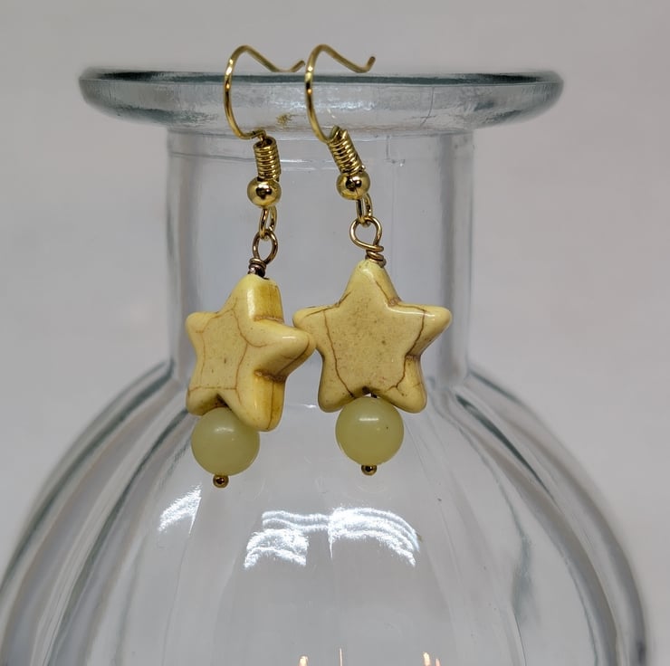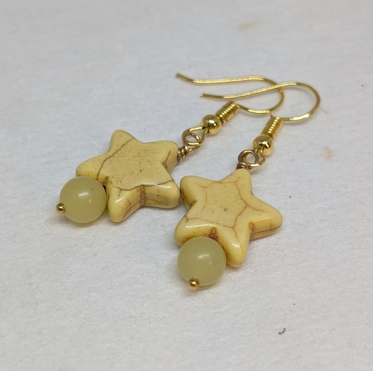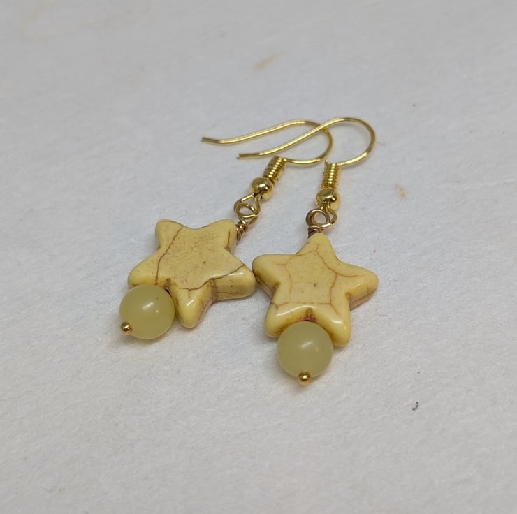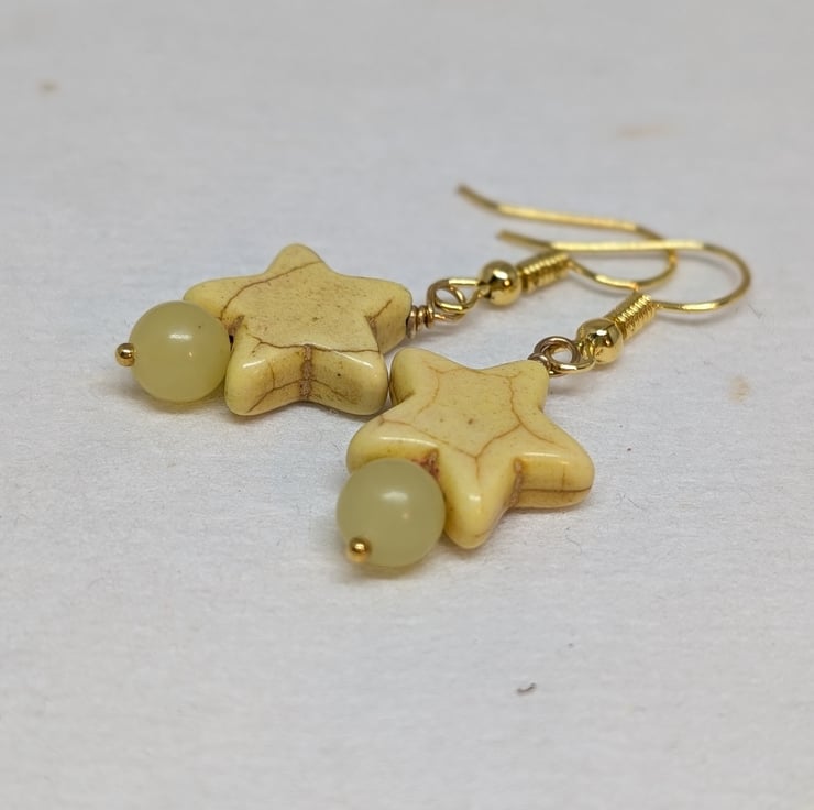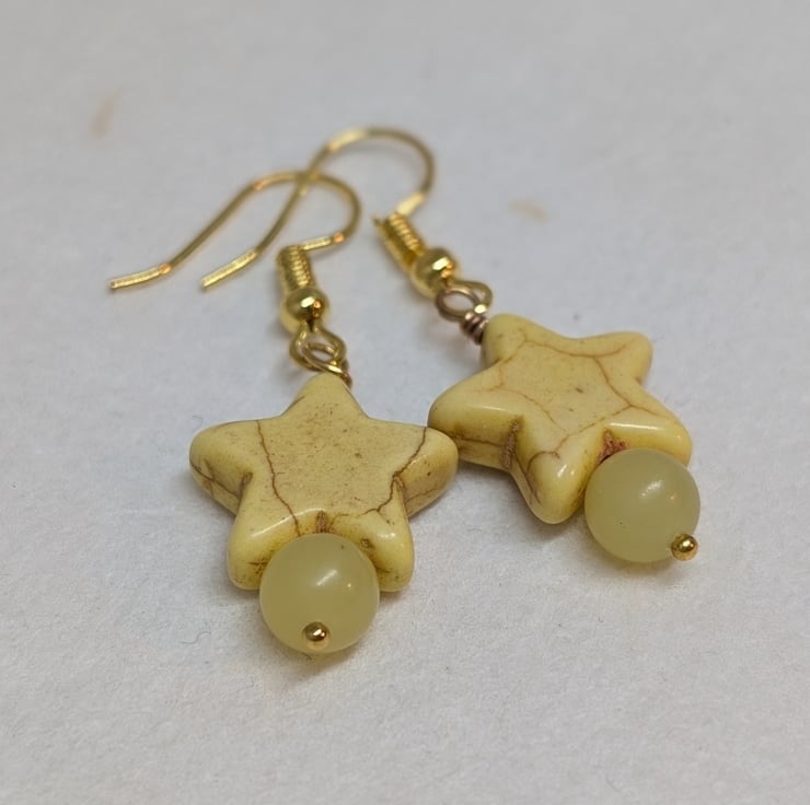 These simple earrings feature chunky howlite stars and round agate beads in pretty shades of yellow. They've been attached to gold coloured ear wires. They measure less than an inch making them small enough for everyday wear.