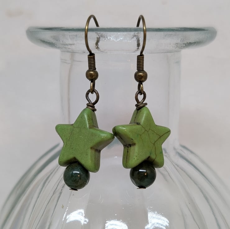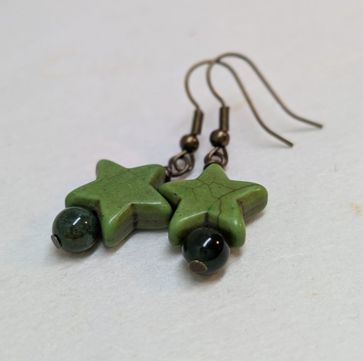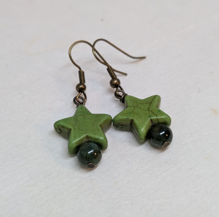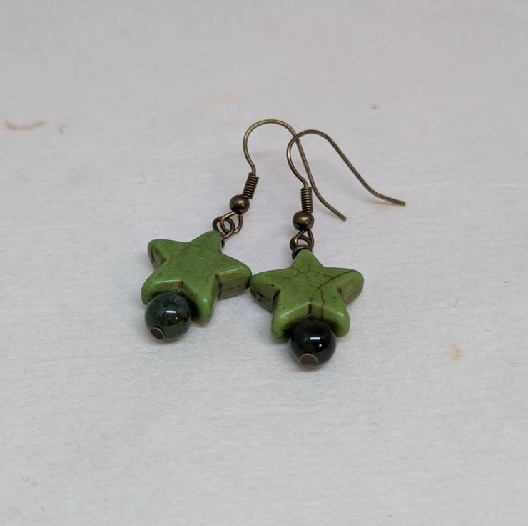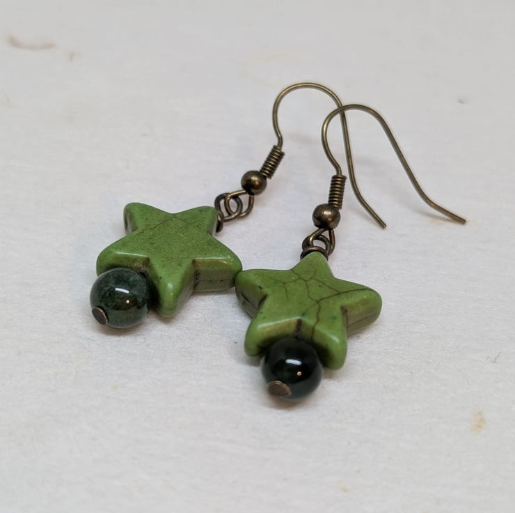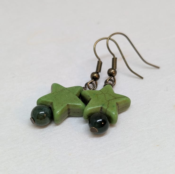 These simple earrings feature chunky howlite stars and round agate gemstone beads in soft shades of green. Antique gold coloured ear wires have been added to complement these colours. The earrings have a drop of less than an inch making them ideal for everyday wear.