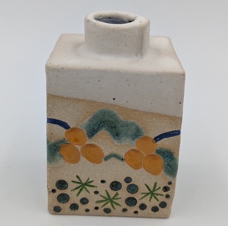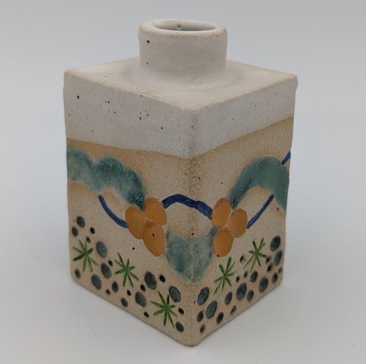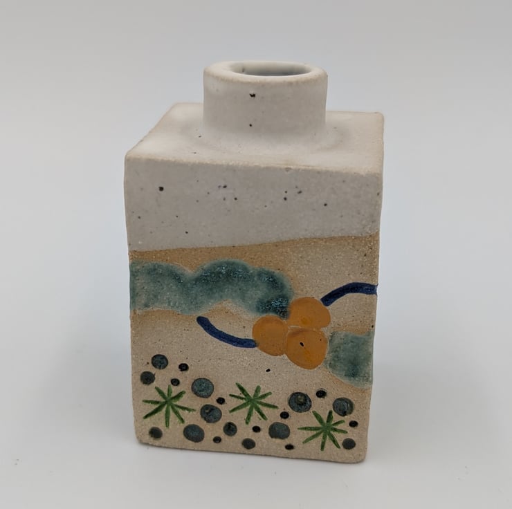 Stoneware bud vase with colours and design inspired by the Cornish coastline at Penwith and the engine houses found along the tin coast of Cornwall.