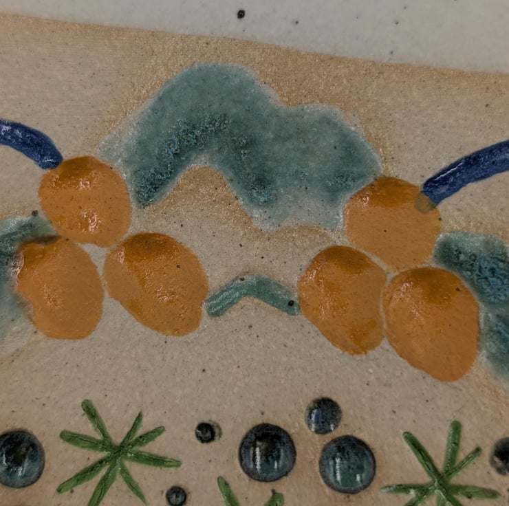 Slab built in buff stoneware clay and hand decorated with slips, glazes and stains.