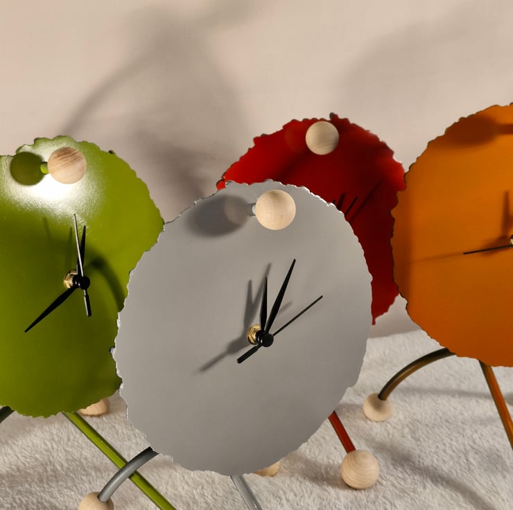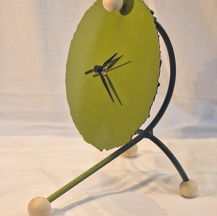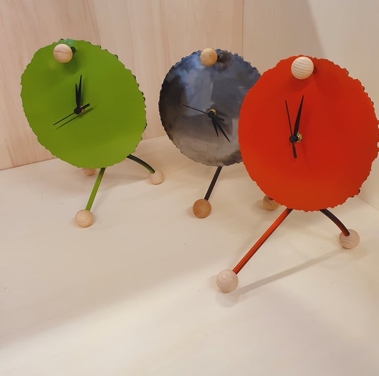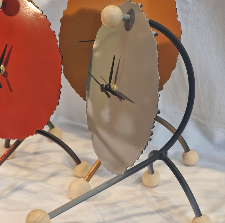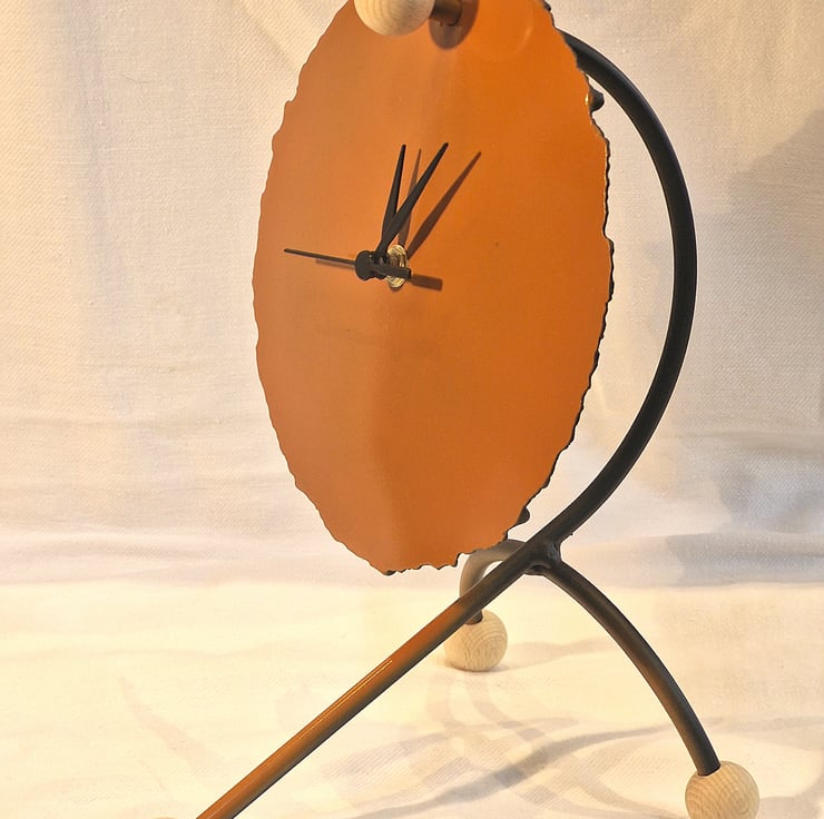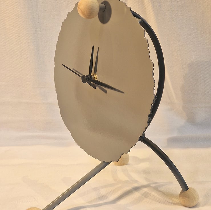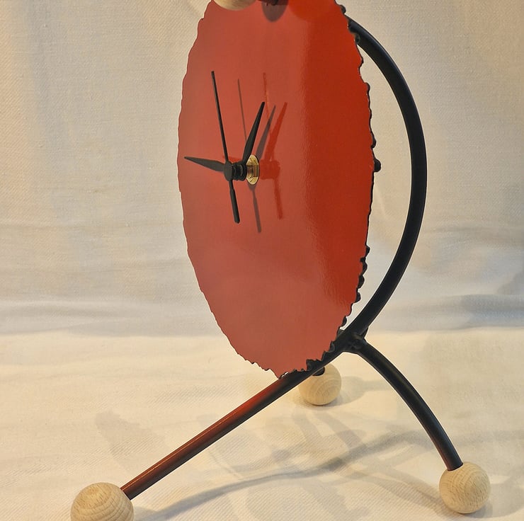 Steel Arc clock made by cranking up the Arc welder to cut a disc, steel frame, paint finish with Beech sphere details. Supplied with a sweep clock mechanism,