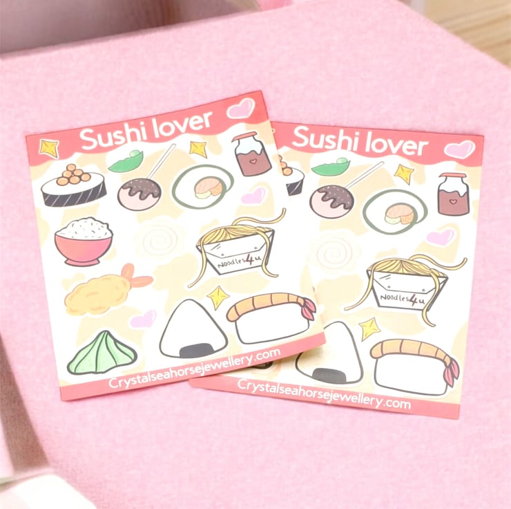 Each one’s packed with 19 hand-drawn sushi pals — from cozy onigiri and classic nigiri to rice bowls, chopsticks, and a few tasty surprises.
