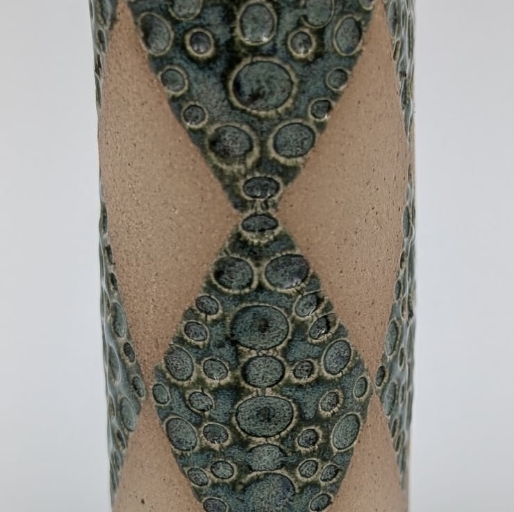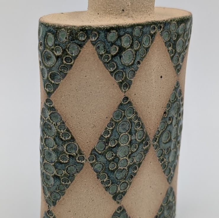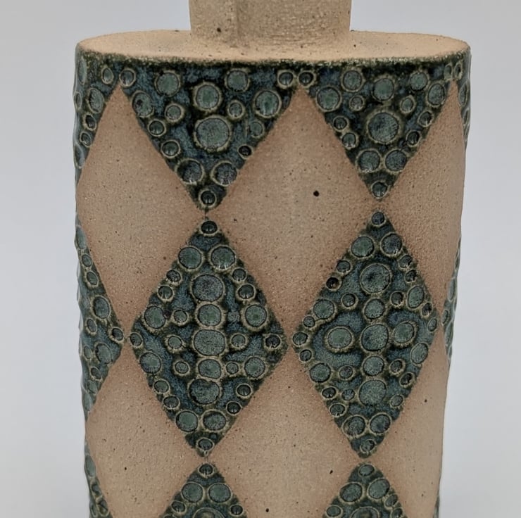 Slab built in stoneware clay with a hand impressed diamond pattern design and texture.