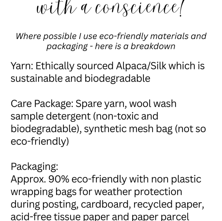 I like to work with natural and sustainable fibres to make my ready-made knitwear and accessories. The idea that an item can be worn or used and then ethically discarded when it is finished with is appealing and something that is becoming more achievable. Most of my packaging is made from recycled materials that are also compostable, but there are still some elements that I have yet to find a viable alternative for such as sticky labels and printer inks.