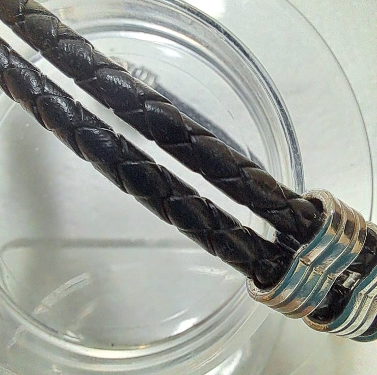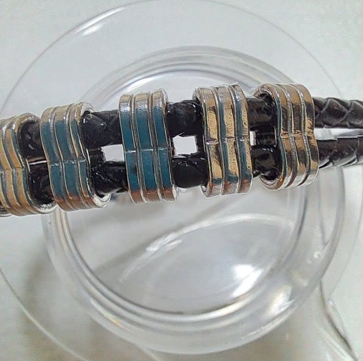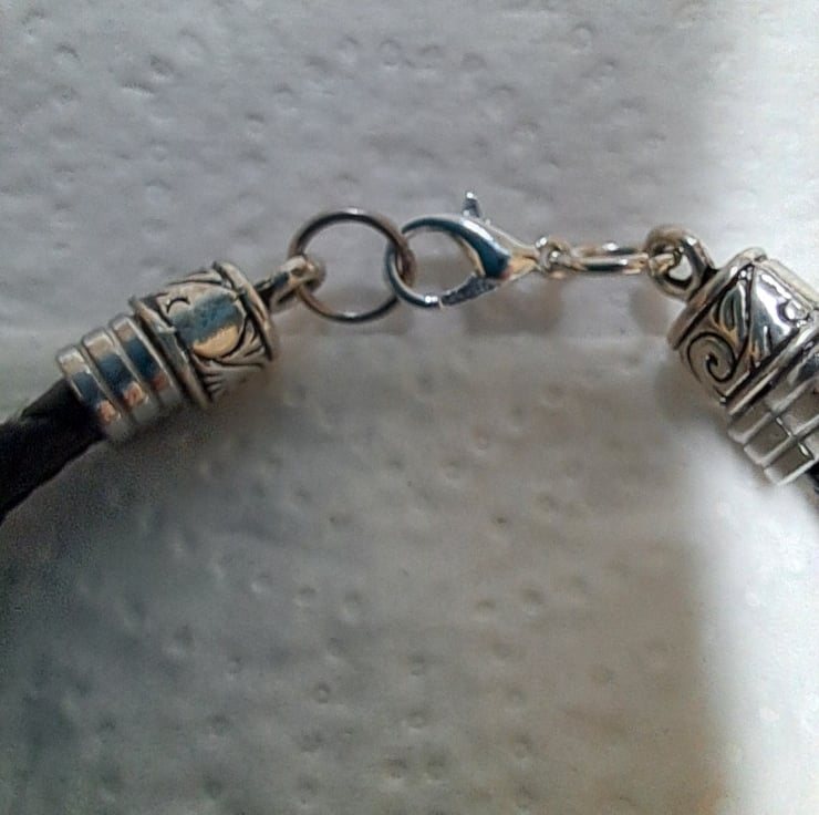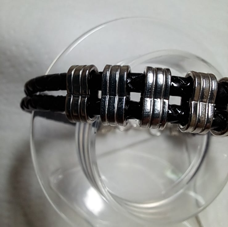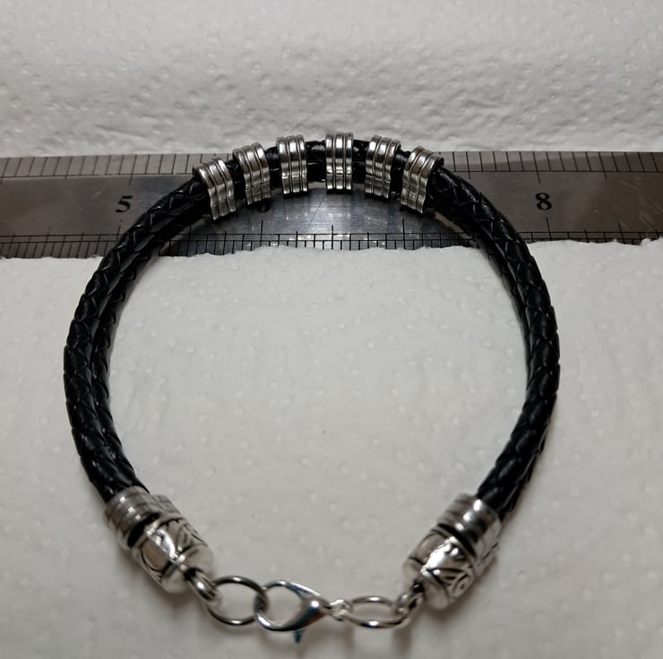 Double 4mm Plaited Black Leather cord Gate bracelet. With13mm silvertone metal spacers and endings. Lobster claw fastener. Handmade. Will fit up to 7.1/2" wrist. Thankyou for looking. Lori