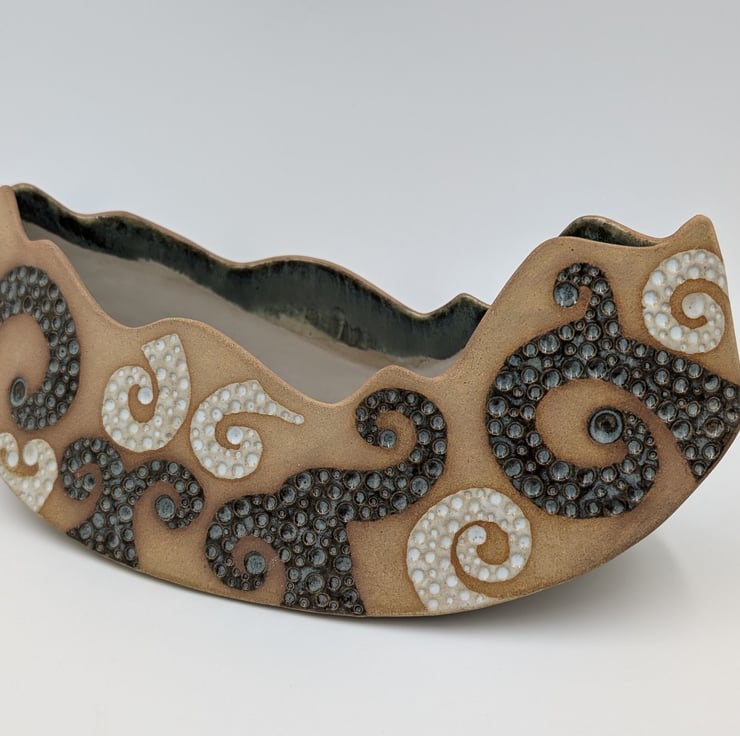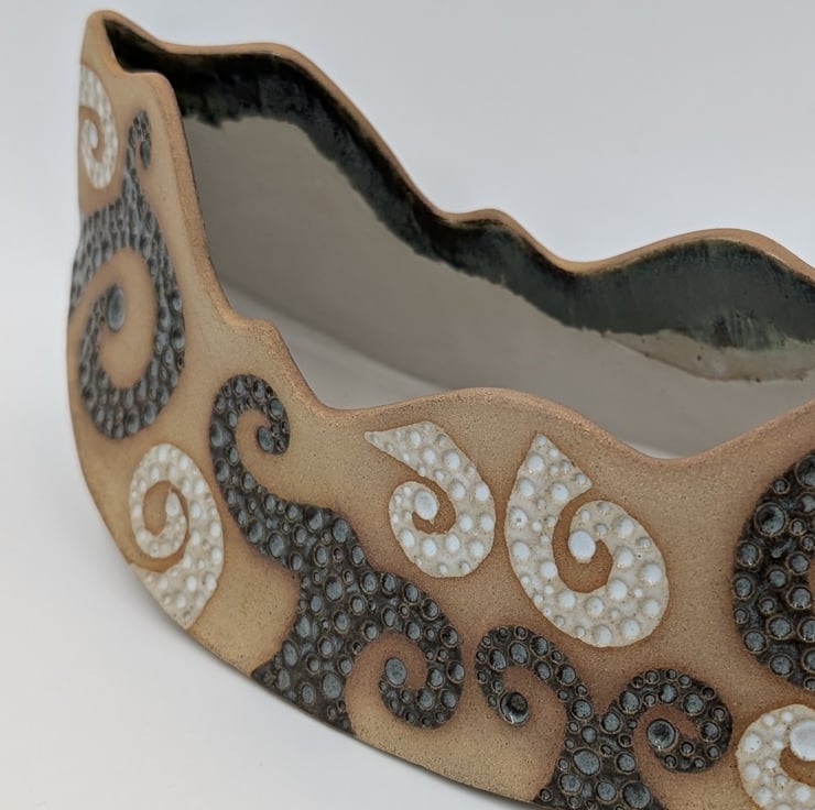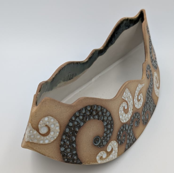 Abstract Vessel with 'wave' design'. Slab built stoneware vessel with white interior and blue and white hand impressed 'wave' design.