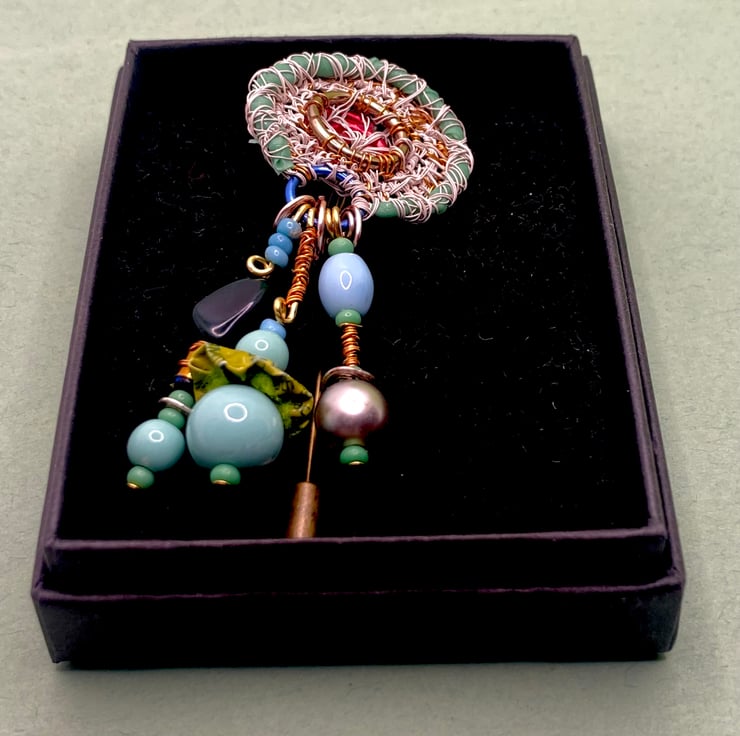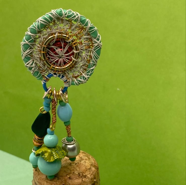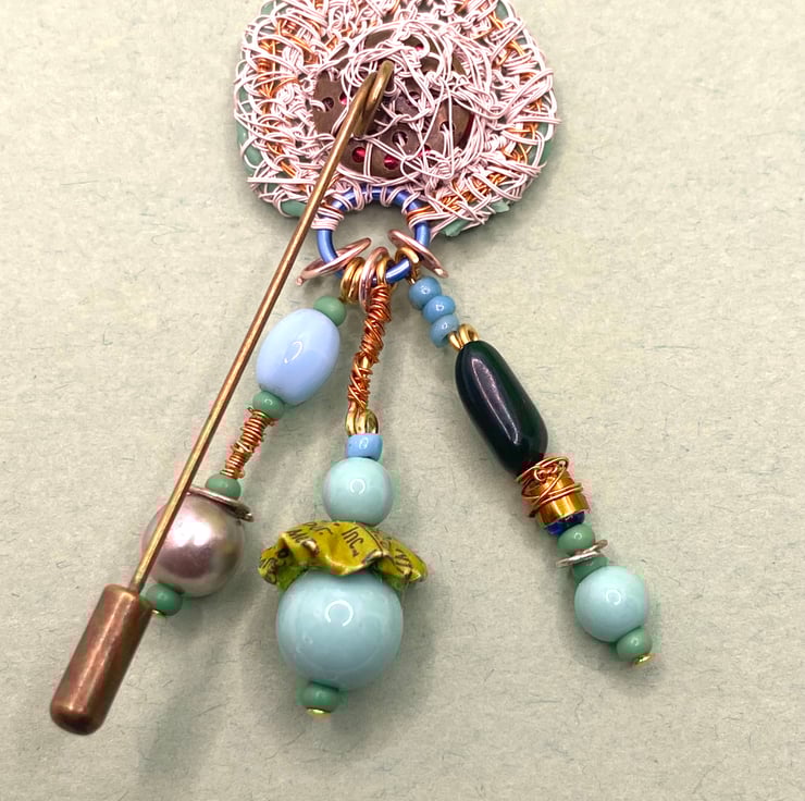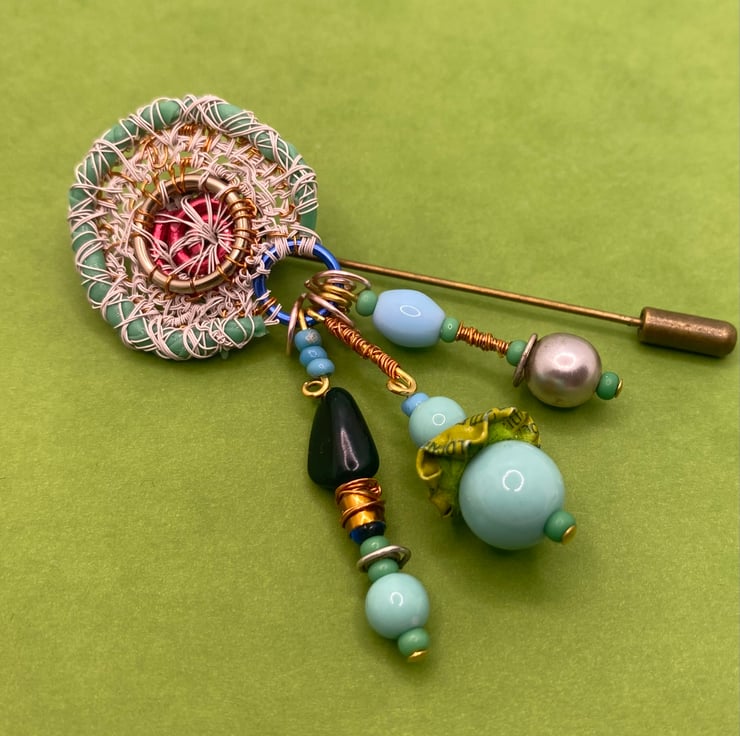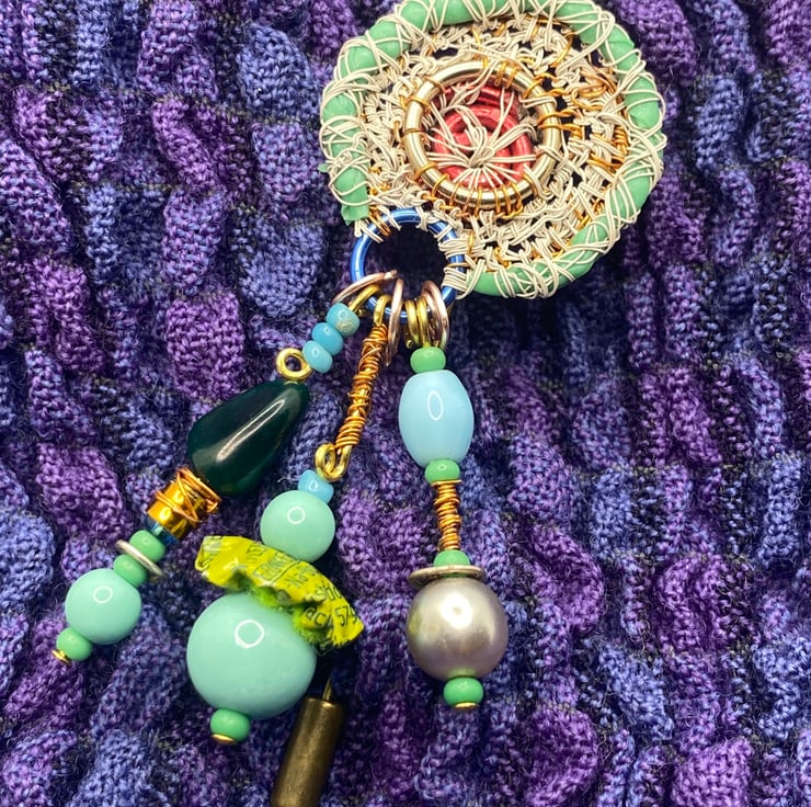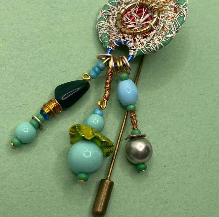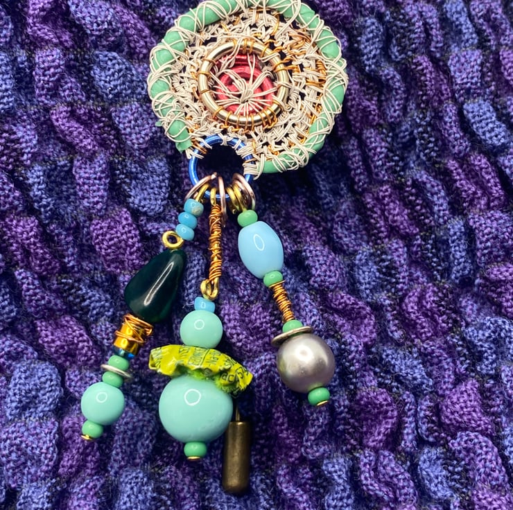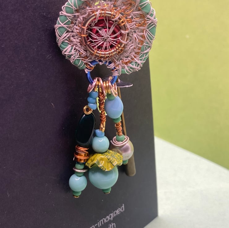 Dangly pin - TV wire, fabric, glass and repurposed metal and fabric