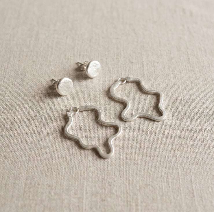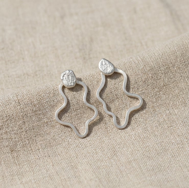These handmade sterling silver earrings are designed with a softly textured stud and a free-form wavy drop hoop that moves gently as you wear it. The shape is organic and intentionally irregular, giving each pair a relaxed, natural feel.