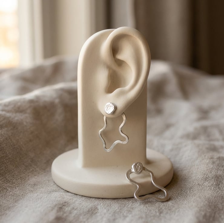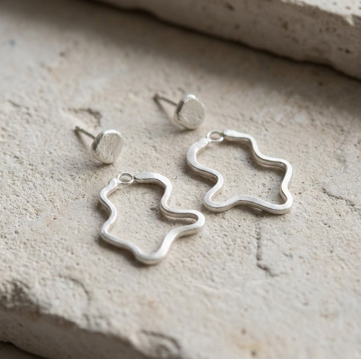 I was inspired by the natural movement of molten silver and the imperfect shapes that happen when metal is worked by hand. I wanted to create earrings that felt relaxed and organic rather than perfectly uniform, with a simple stud paired with a fluid drop that moves as you wear it.