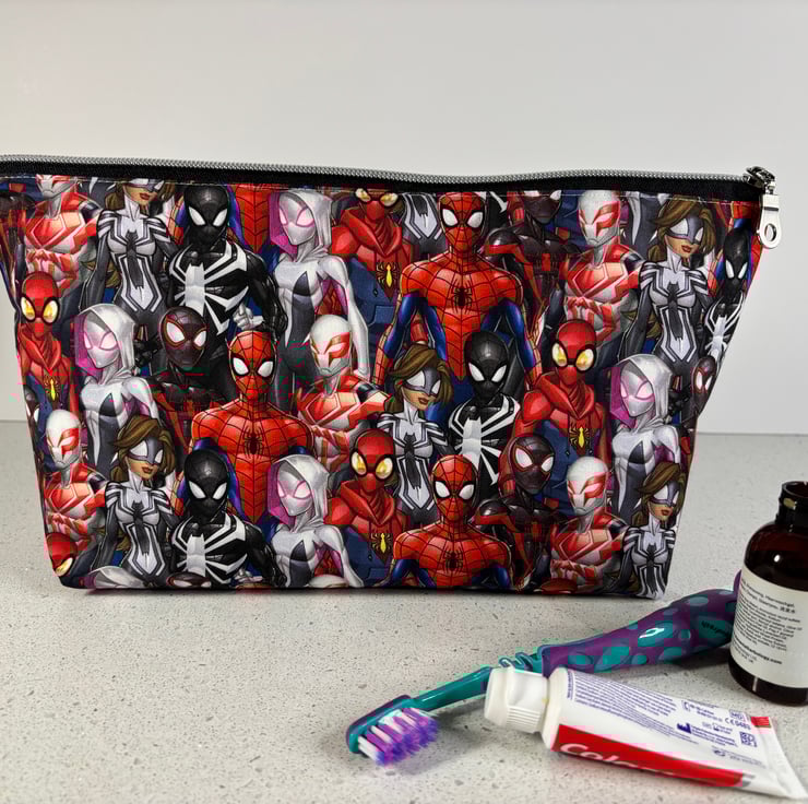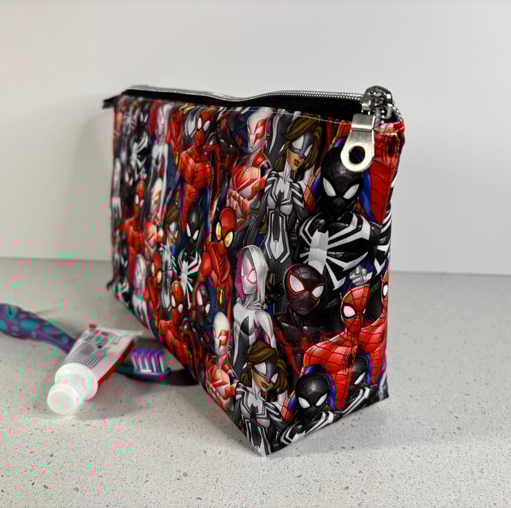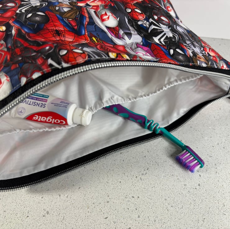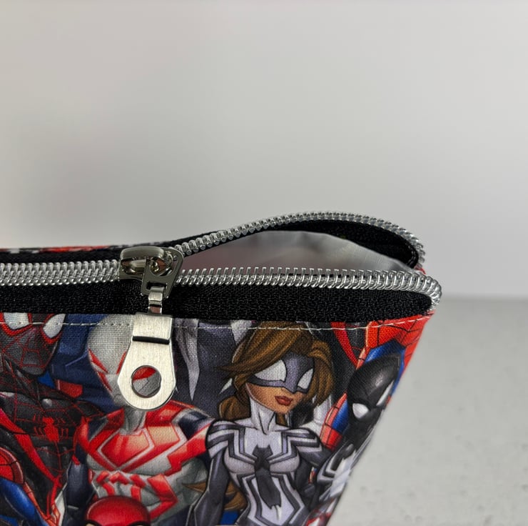 The cotton exterior features all the favourite marvel characters and the lining is a waterproof, white ripstop. There is a gently elasticated internal pocket, and the zip is black with a chunky, chrome zip pull.