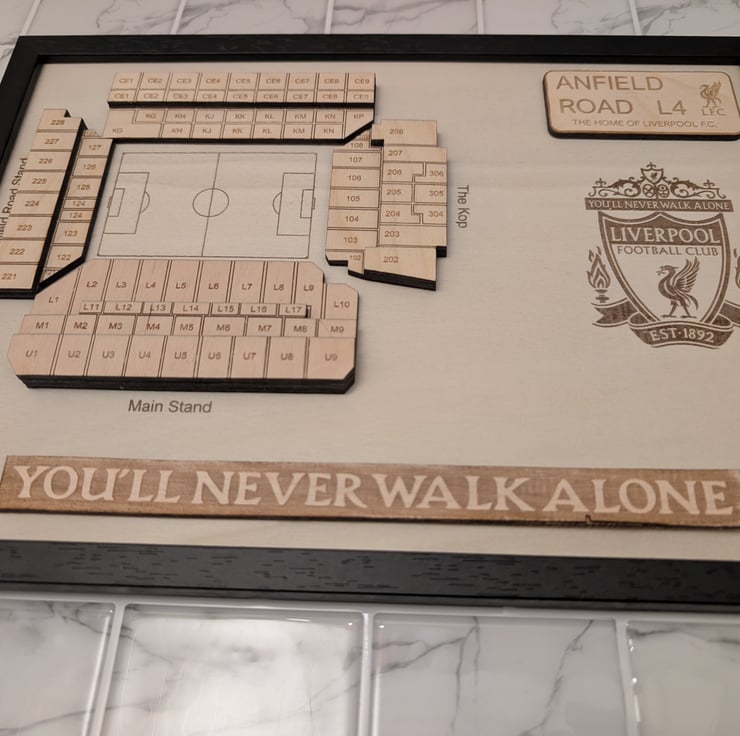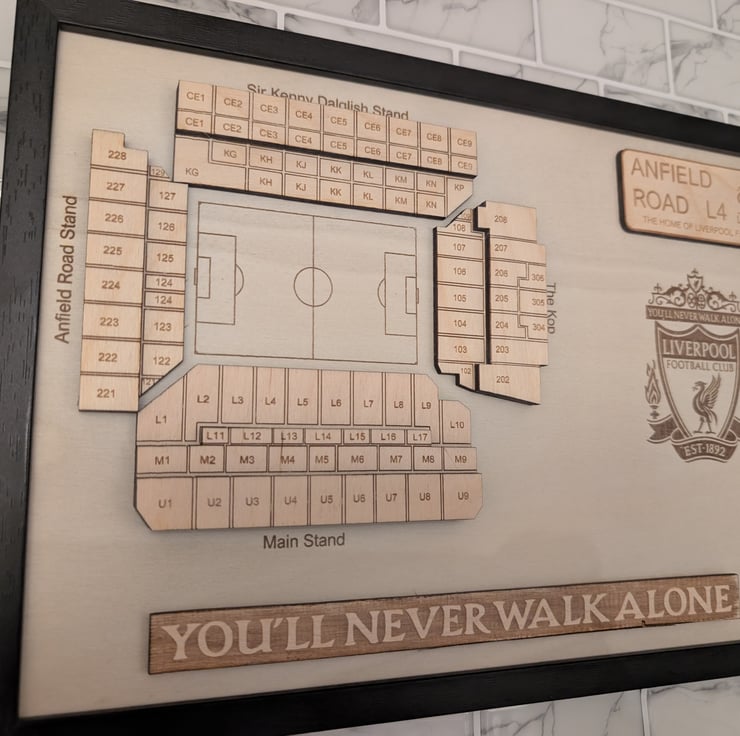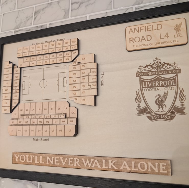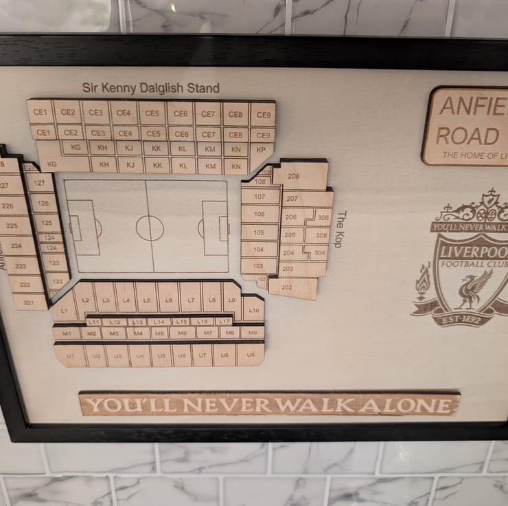 Laser engraved Liverpool FC wall plaque featuring a 3D model of Anfield Stadium seating plan as well as an engraved "You'll Never Walk Alone" banner. This is the perfect gift for any Liverpool fan and will bring a touch of class to any mancave. Other teams available on request.