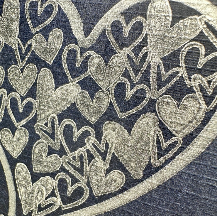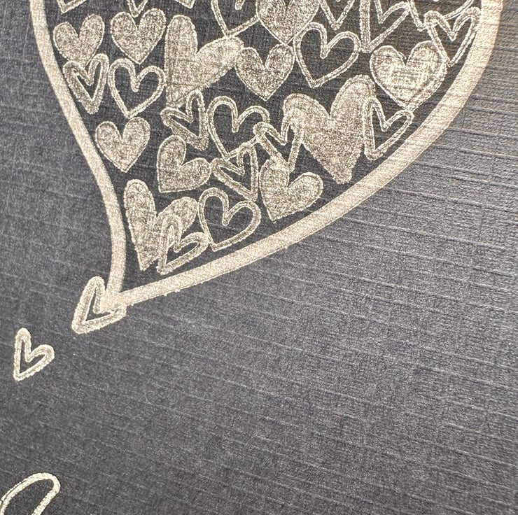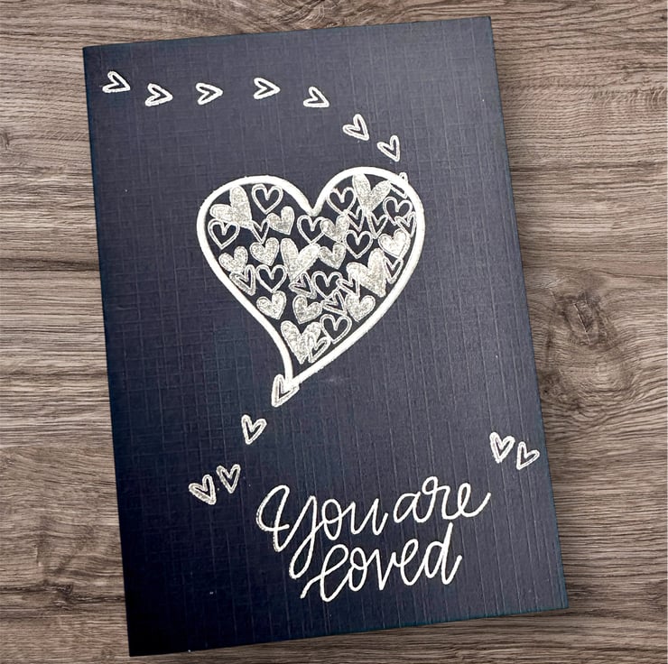 Hand-drawn in shimmering silver metallic ink, a large heart overflows with dozens of smaller hearts—love spilling freely and joyfully across the design. The sentiment continues below with the simple, reassuring message “you are loved”.