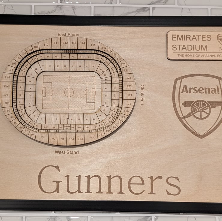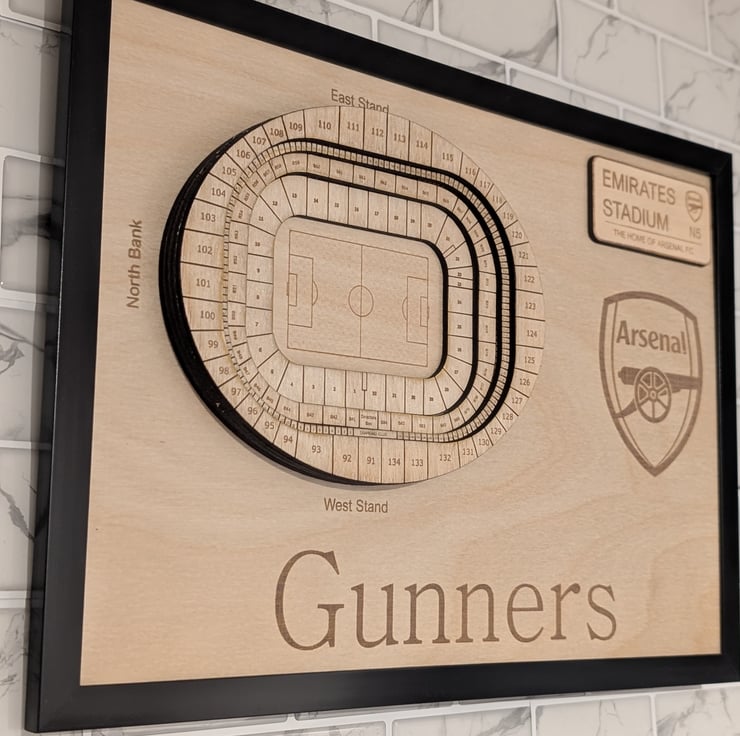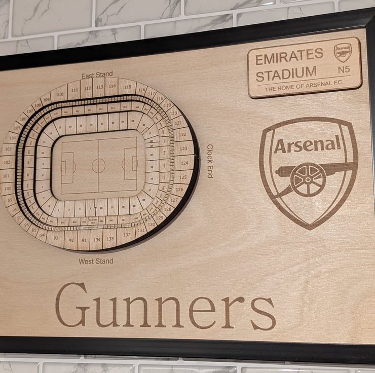 Laser engraved Arsenal FC wall plaque featuring a 3D model of the Emirates Stadium seating plan as well as an engraved "Gunners" club nickname. This is the perfect gift for any Arsenal fan and will bring a touch of class to any mancave. Other teams available on request.