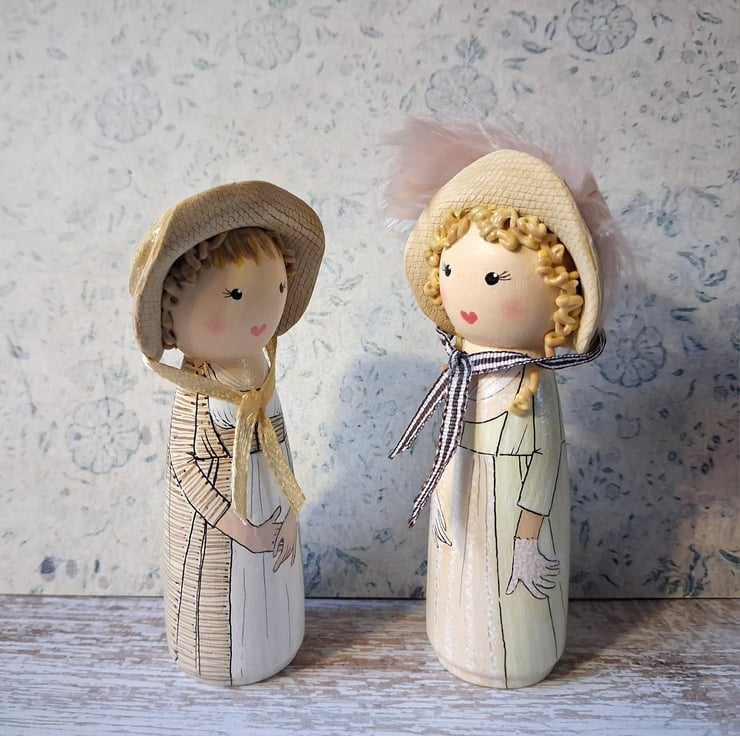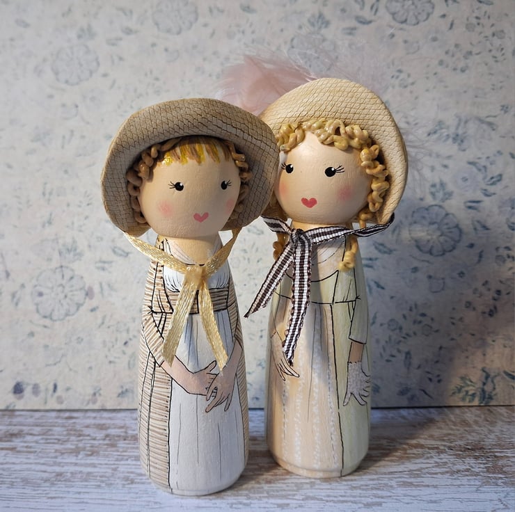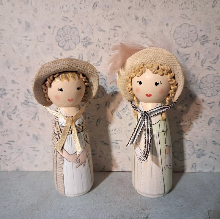 Hand-painted pair of pegs dolls, based on the 1995 film of Jane Austen's Sense & Sensibility