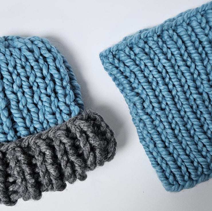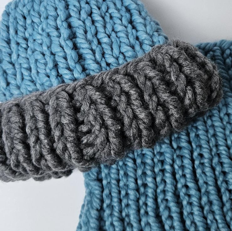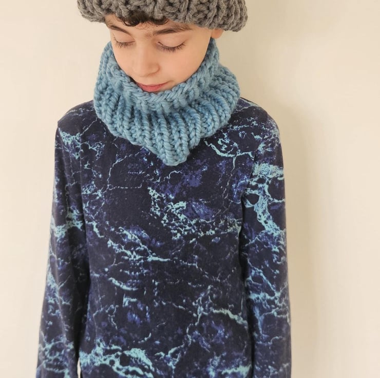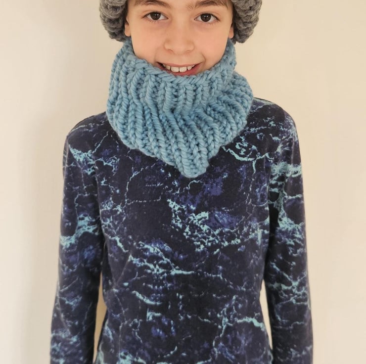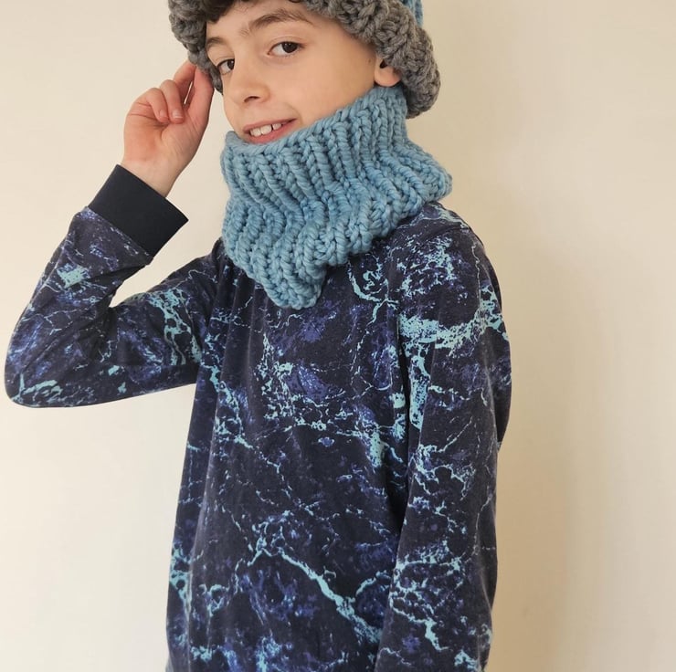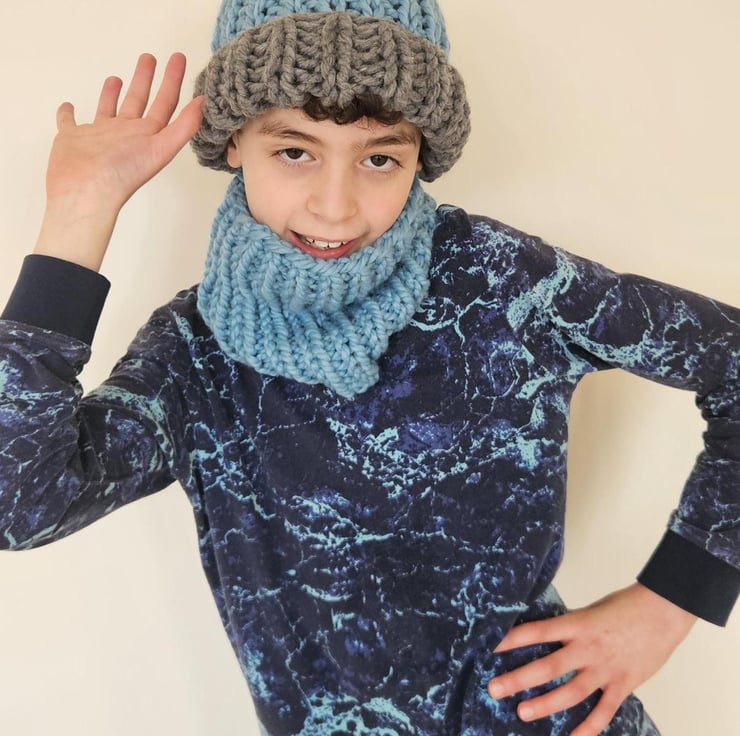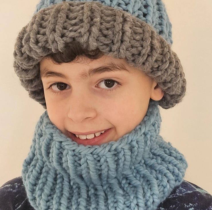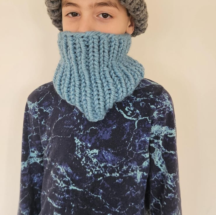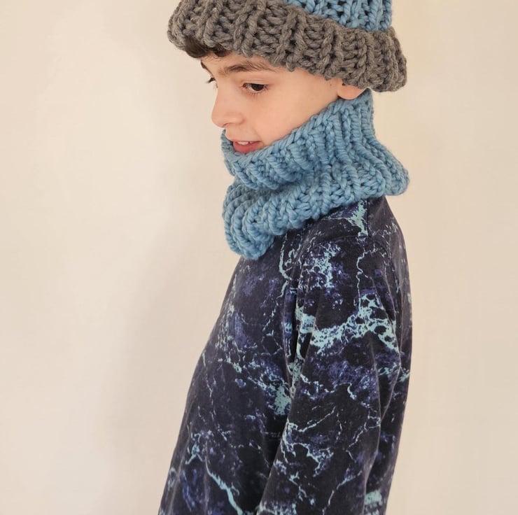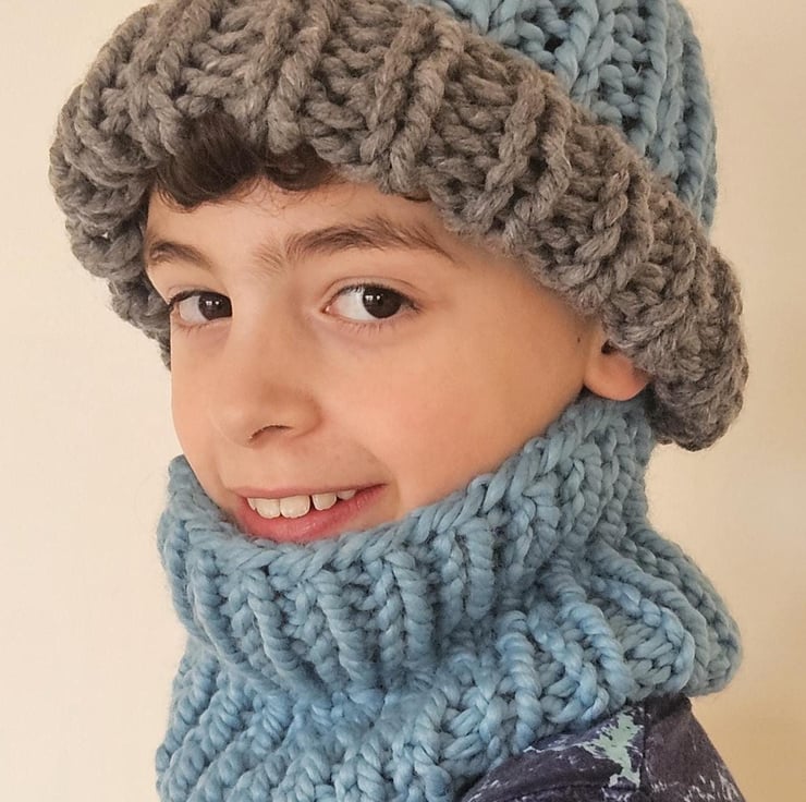 Children's 5-10 Years Unisex Blue and Grey Hand-Knitted Extra Chunky Soft Acrylic AutumnWinter Beanie Hat and Cowl Set For Sale.