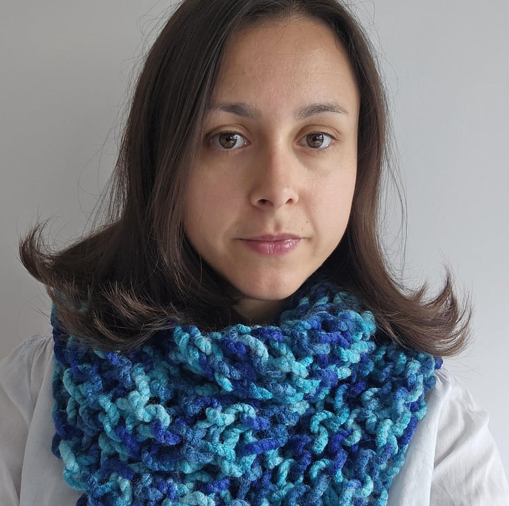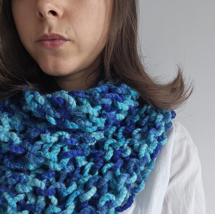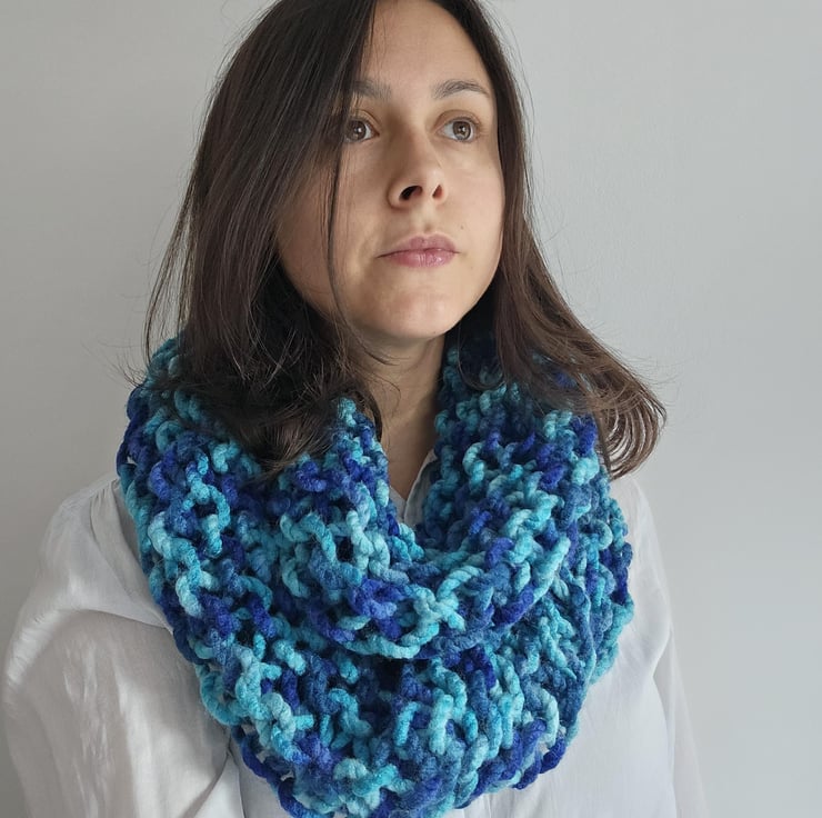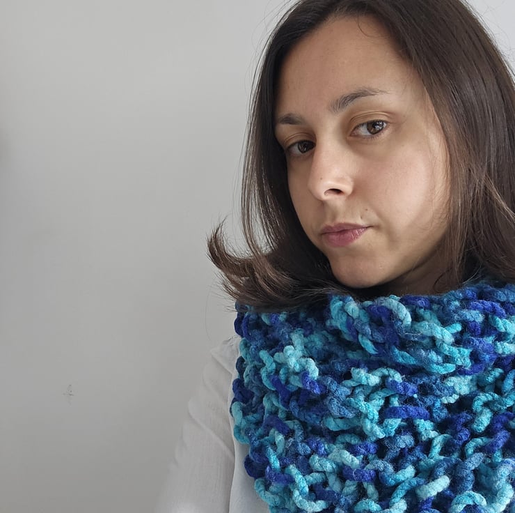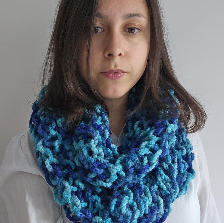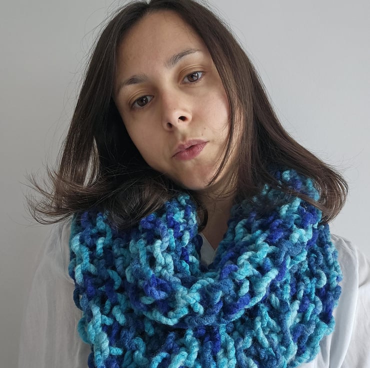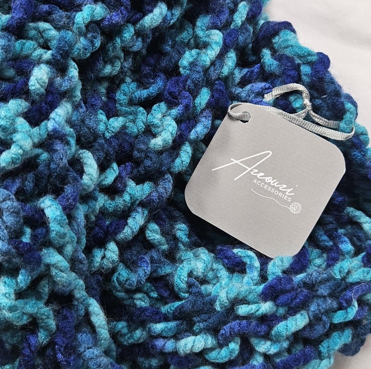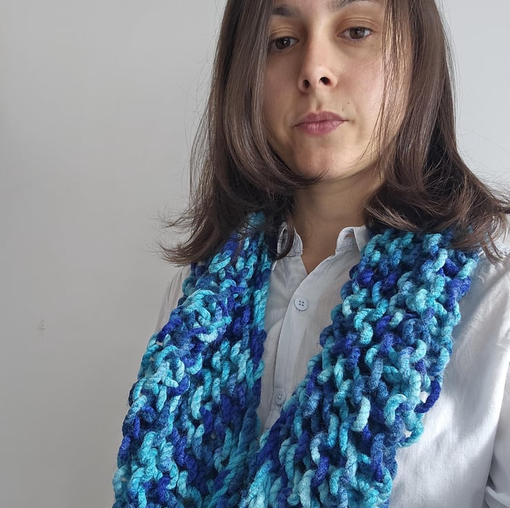 Created out of soft chunky blue acrylic yarn, this beautiful yet minimalist statement accessory will compliment any autumnwinter outfit.
