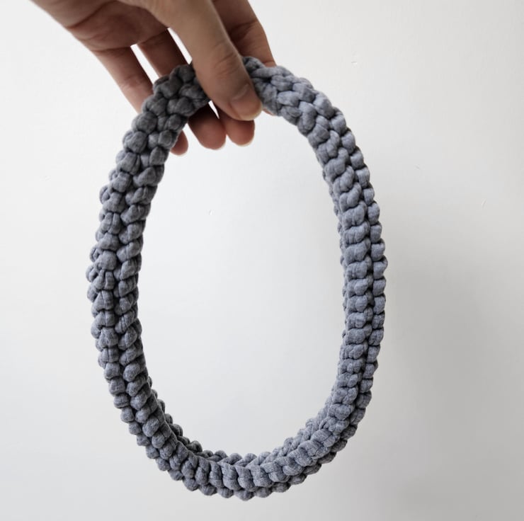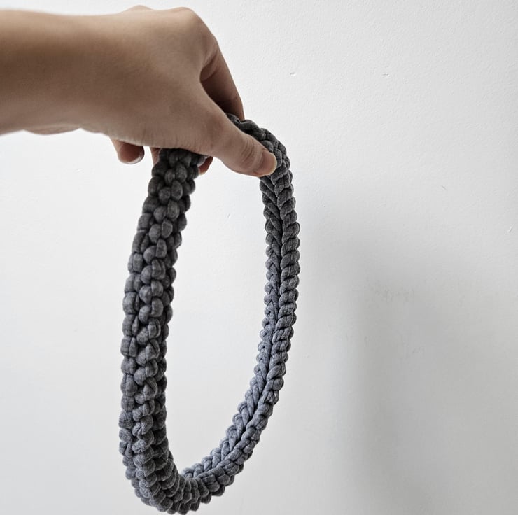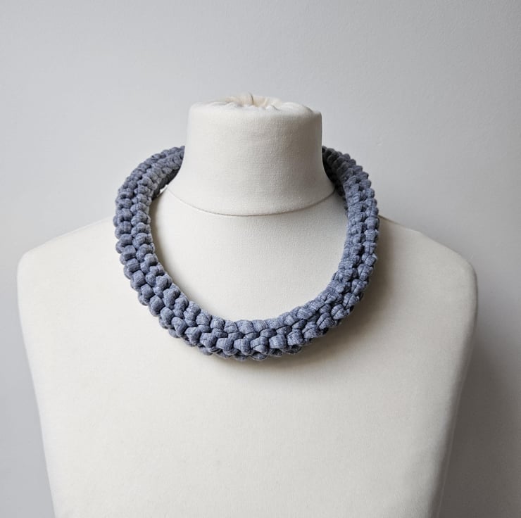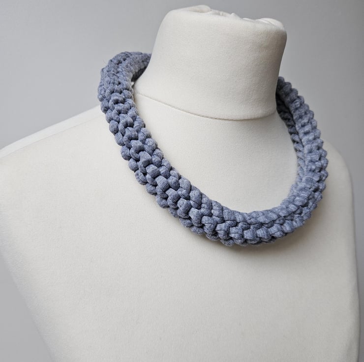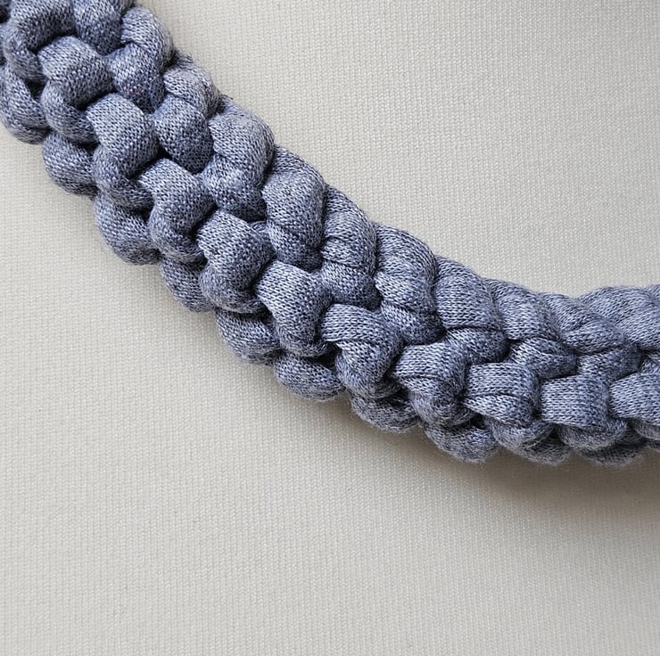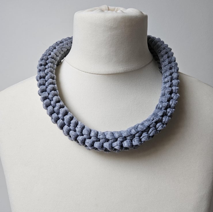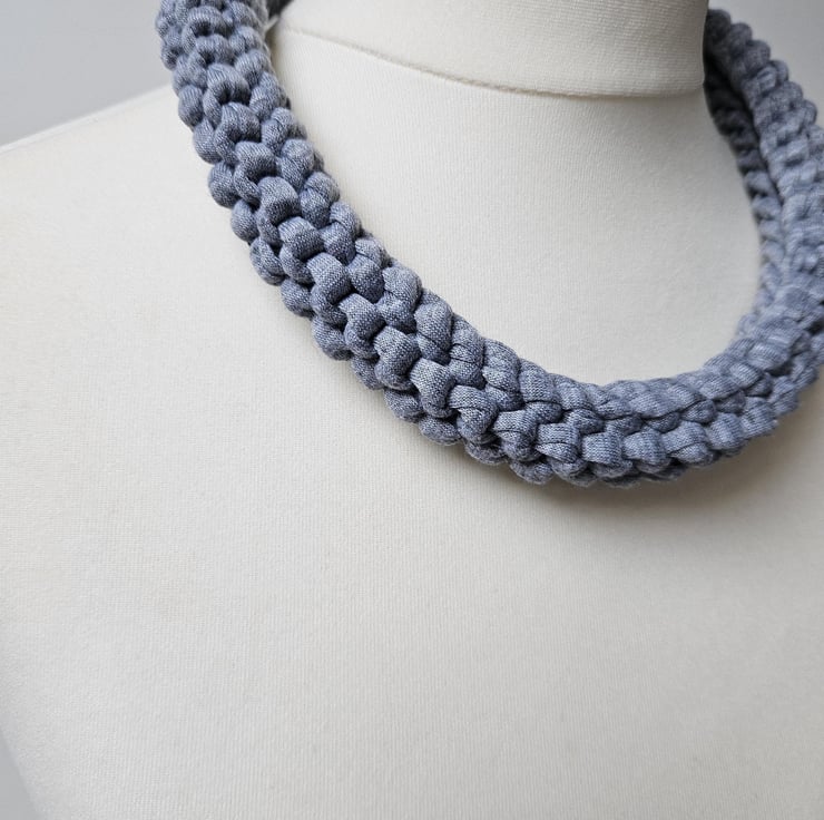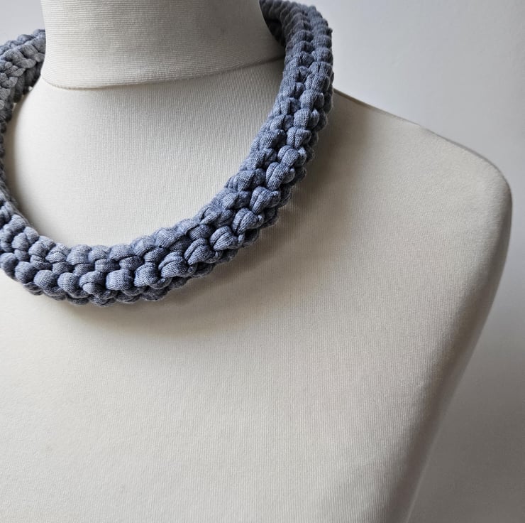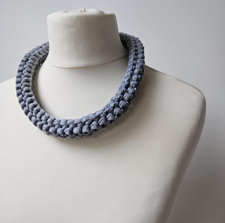 Women's T-Shirt Yarn Recycled Stretch Eco-Friendly Minimalist Grey Chunky Knit Handmade Statement Fabric Necklace For Sale.