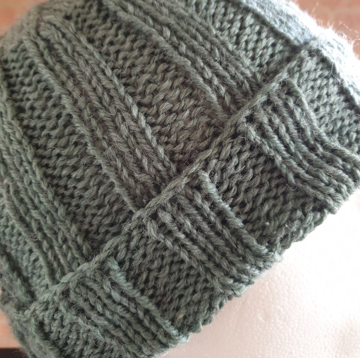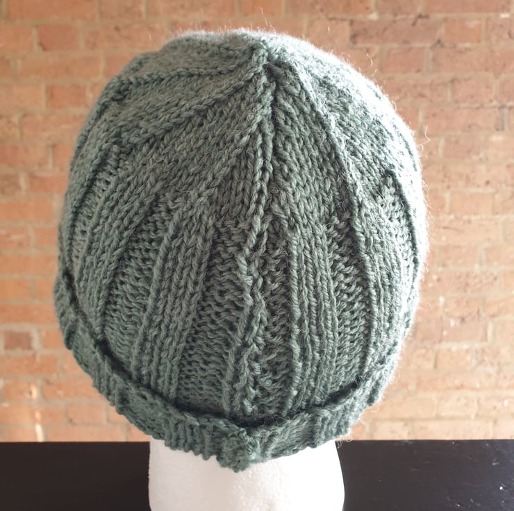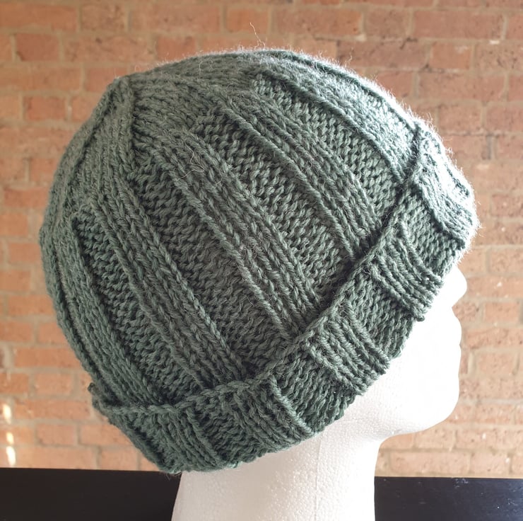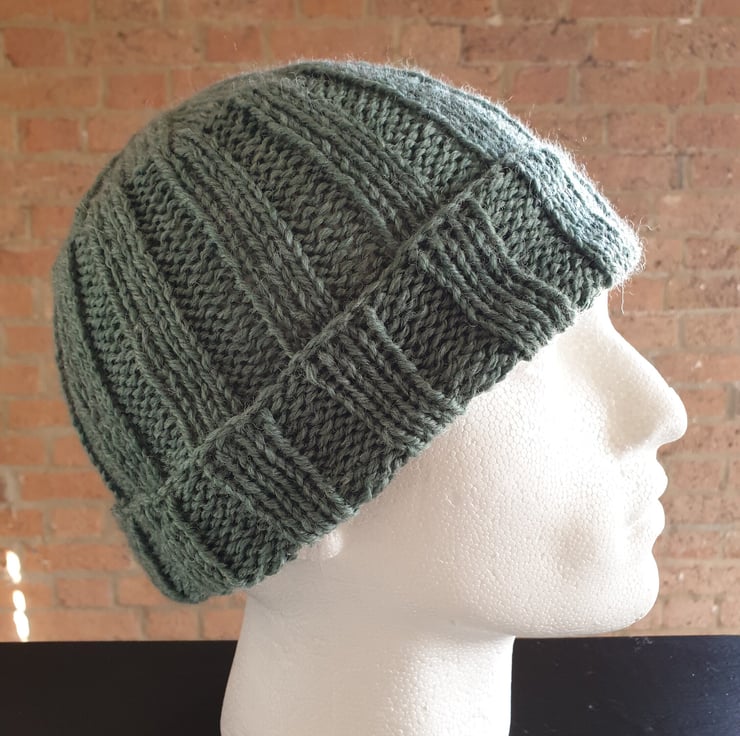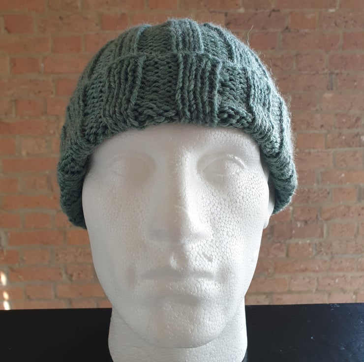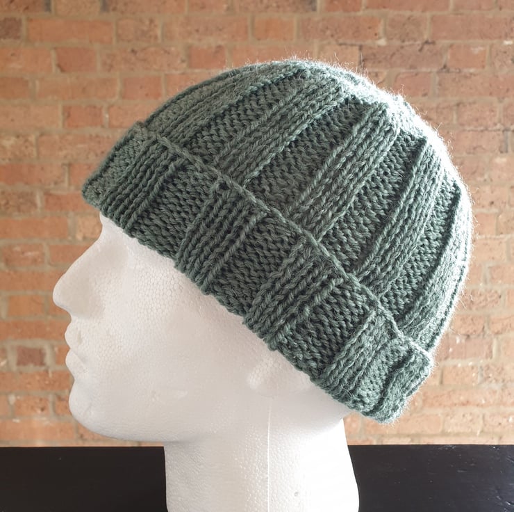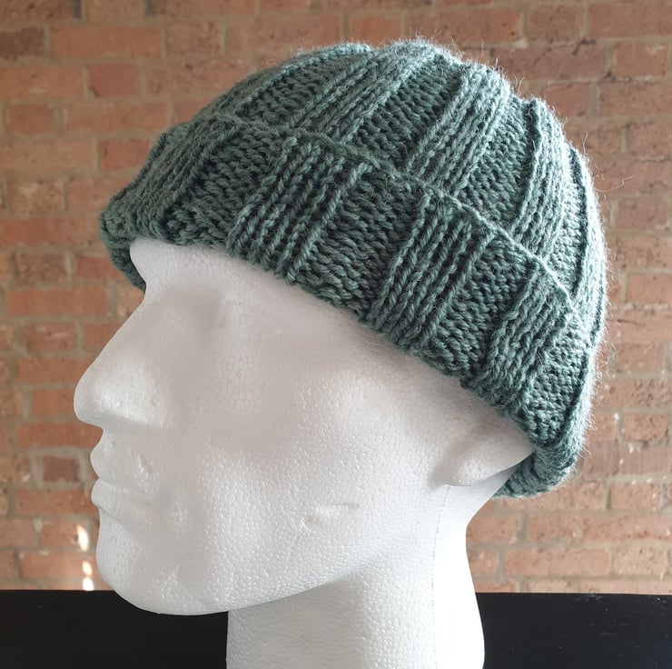 Men's Rib Stitch Hand Knitted Jungle Green Stretch One Size Beanie Hat with Brim For Sale.