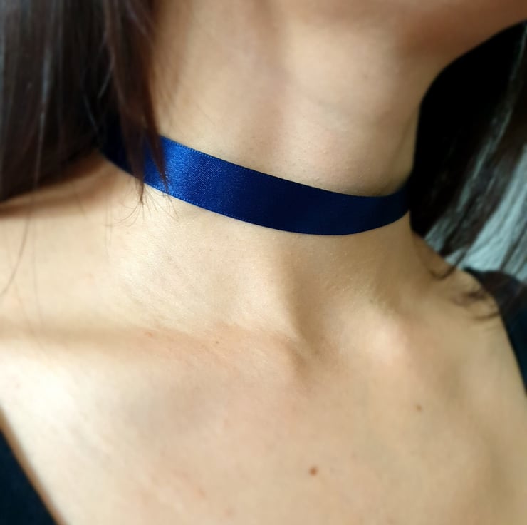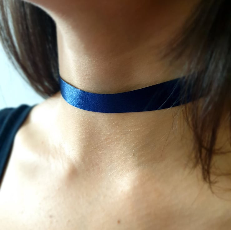 Handmade from whitenavy blue satin ribbon and an aluminium lobster claw fastening with a chain extender, to adjust the length of the choker for a perfect fit.
