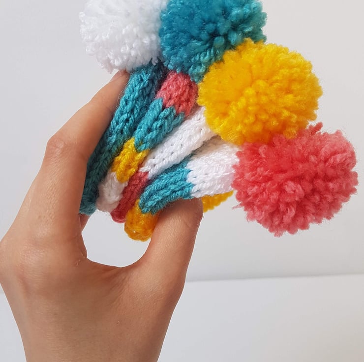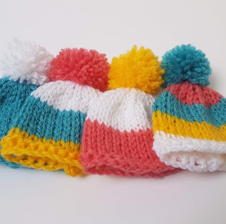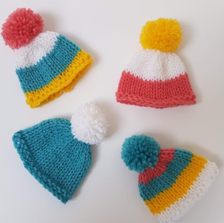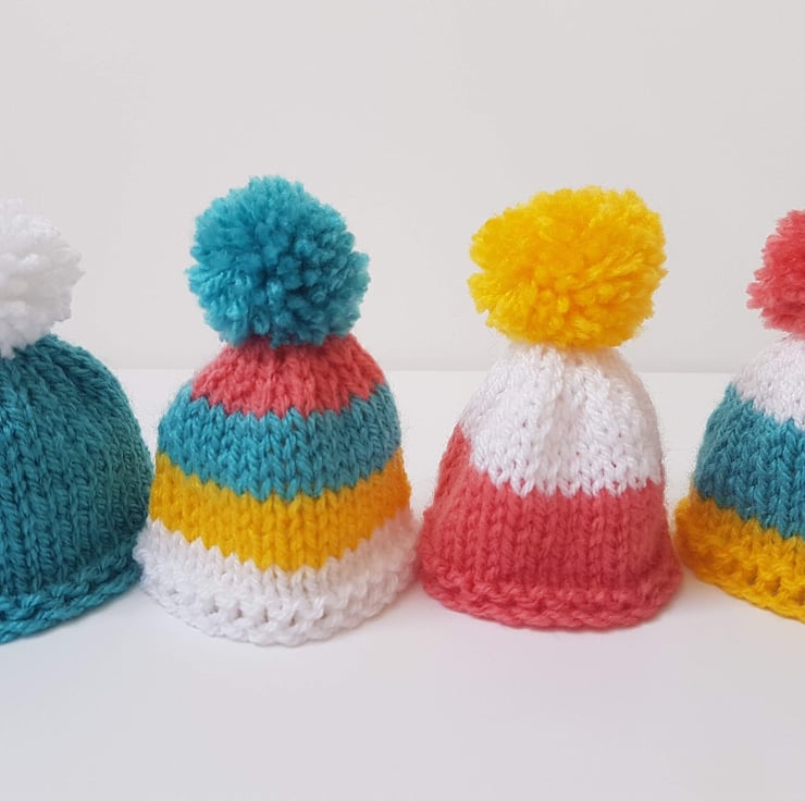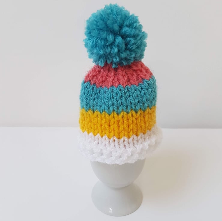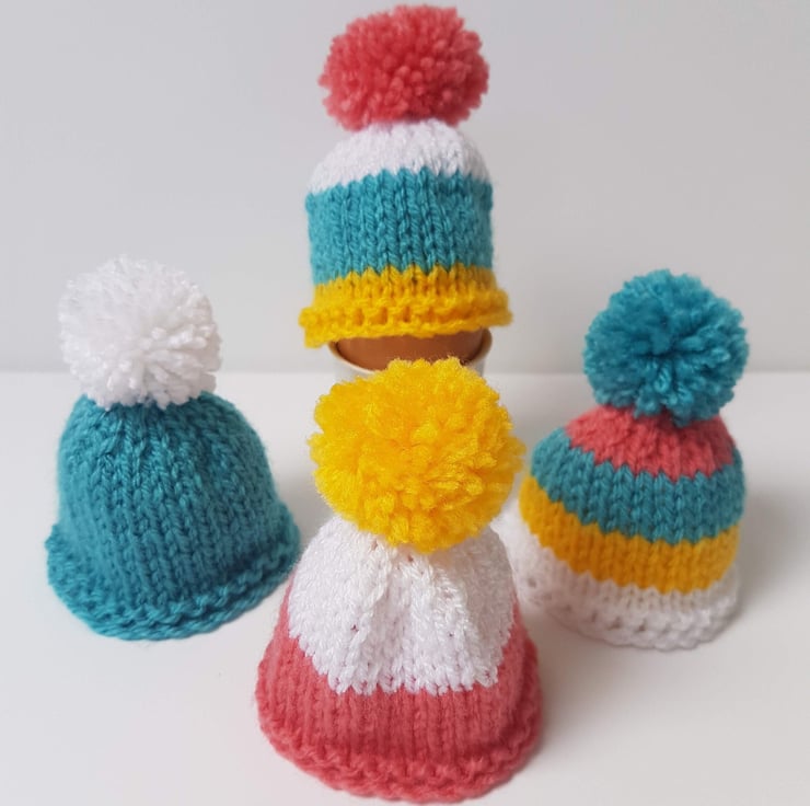 Cute Mini Easter Multi-Coloured Hand-Knitted Egg Cosies with Pom Pom Set of 4 For Sale.
