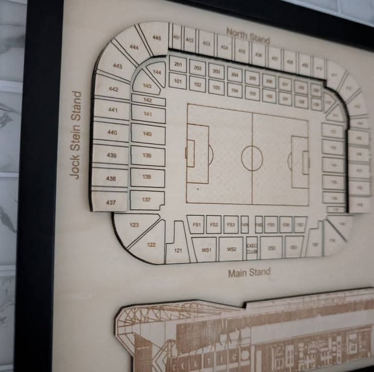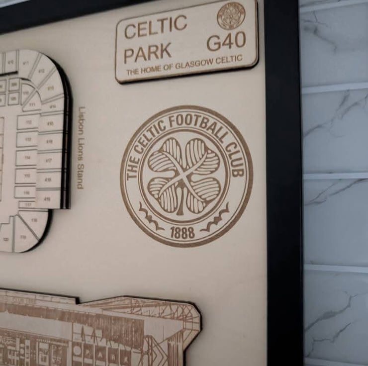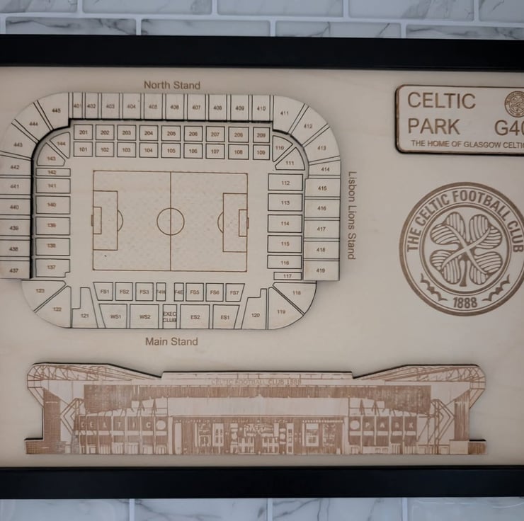 Laser engraved Celtic FC wall plaque featuring a 3D model of Celtic Park seating plan as well as an engraved image of the front of the stadium. This is the perfect gift for any Celtic fan and will bring a touch of class to any mancave. Other teams available on request.
