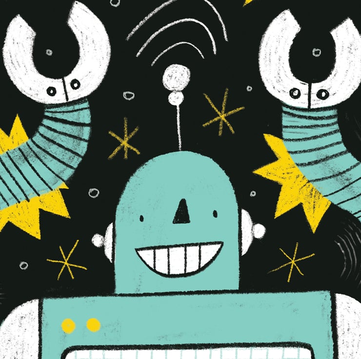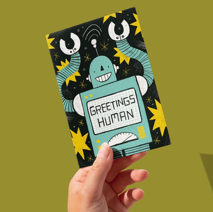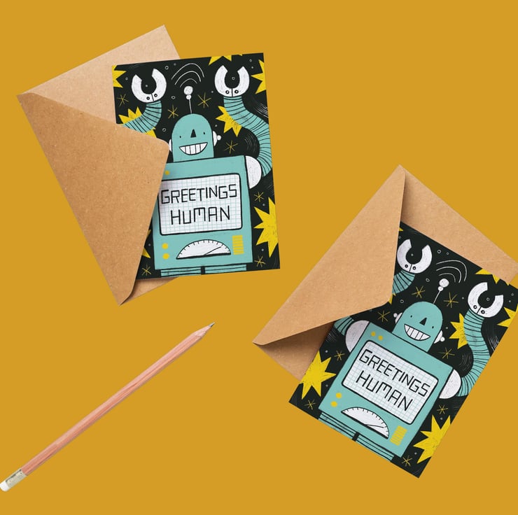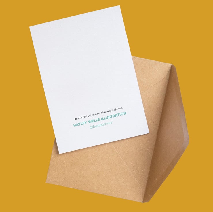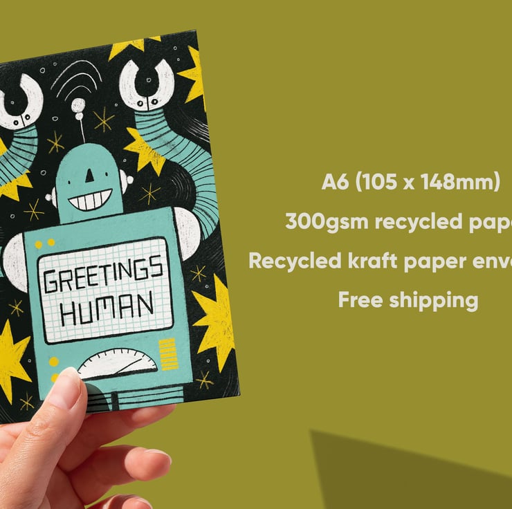 A cute and unique card illustrated by Hayley Wells. For science-fiction enthusiasts, geeks, nerds and humans everywhere, this greetings card is left blank inside for your own message. Each card is made from 300gsm recycled paper, includes a recycled kraft paper envelope, and is shipped using plastic-free packaging.