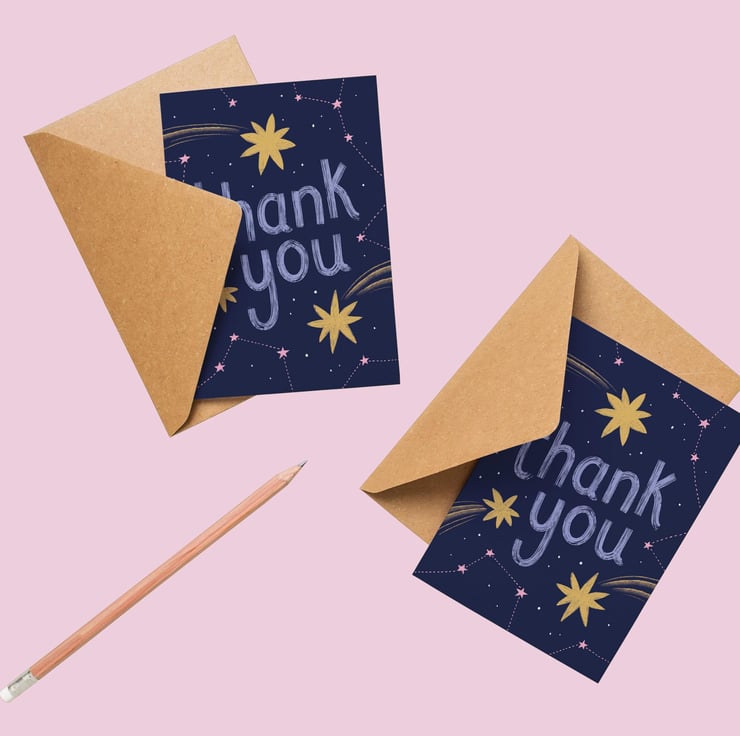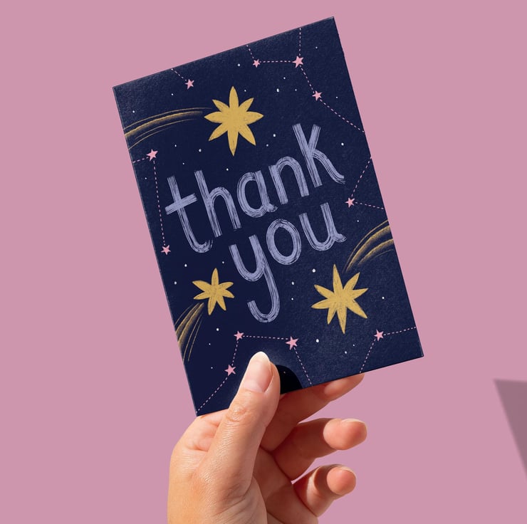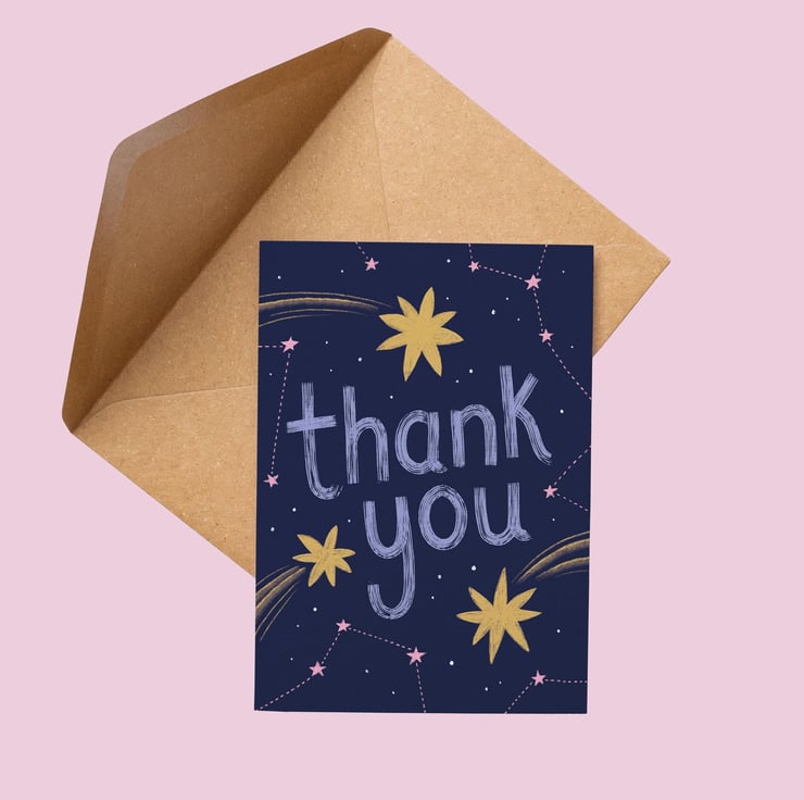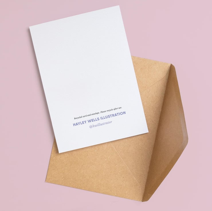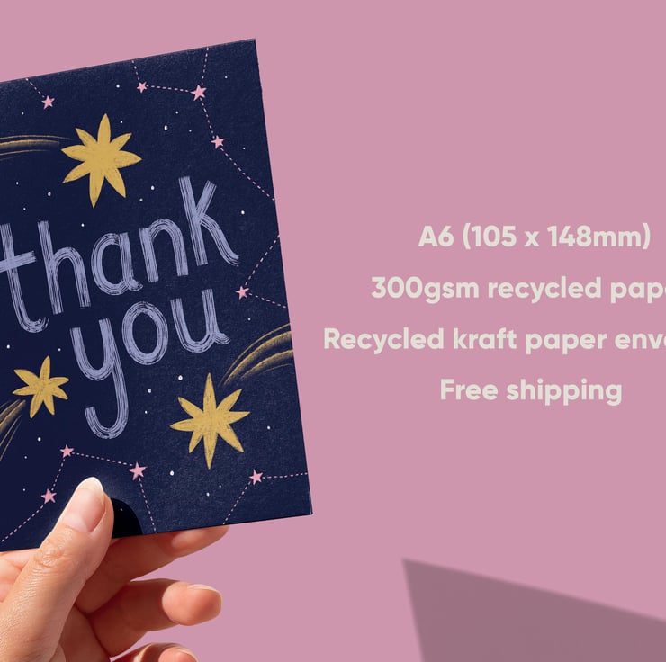 A cute and unique card illustrated by Hayley Wells. Show your thanks with this intergalactic, starry greetings card, which is left blank inside for your own message. Each card is made from 300gsm recycled paper, includes a recycled kraft paper envelope, and is shipped using plastic-free packaging.