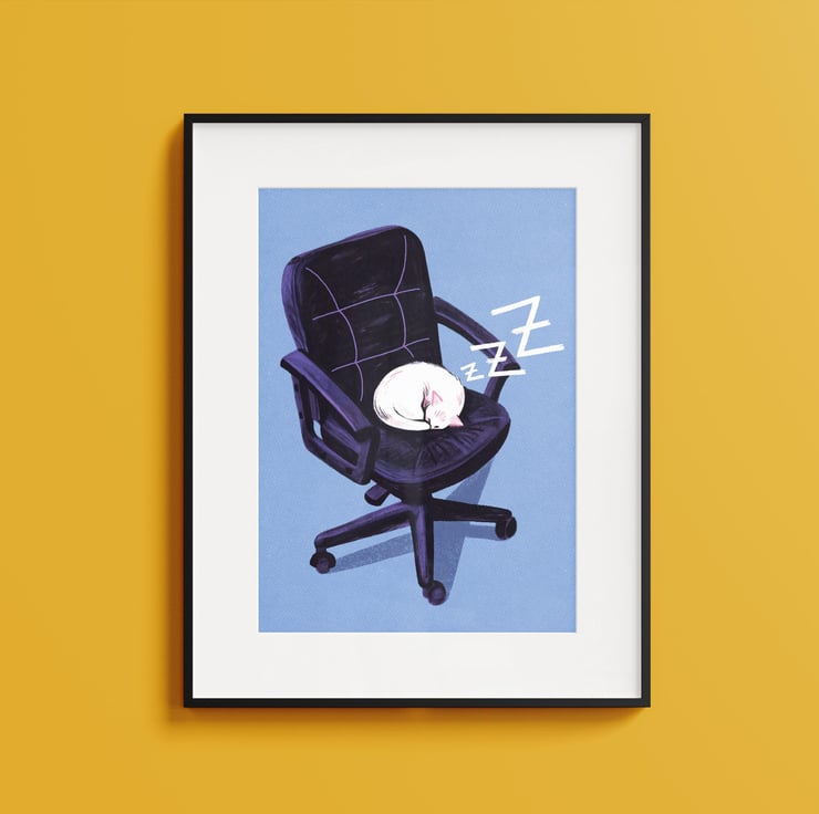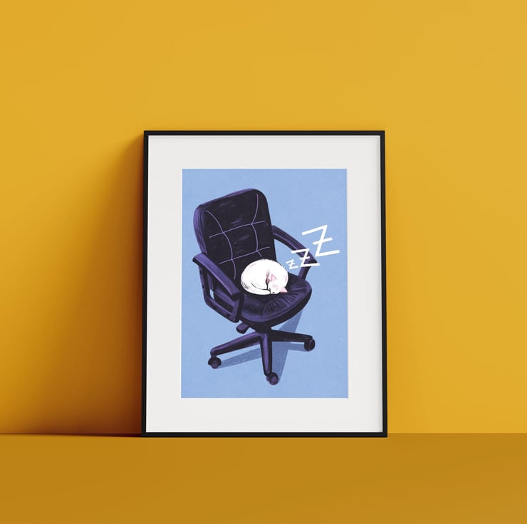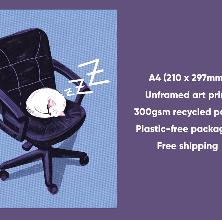 A cute and unique A4 art print illustrated by Hayley Wells. The modern illustration shows a white cat snoozing on an office chair. Perfect for a statement piece in an office or bedroom. Printed on high quality 300gsm recycled paper, this print is unframed and packed in a compostable cellophane sleeve.