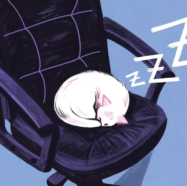 This cute illustration was inspired by my cat assistant, Pinky, who keeps my office chair warm for me when I'm on my lunch break.