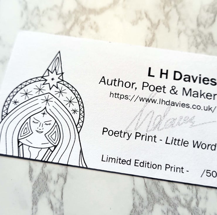 I am a poet/writer and a maker/artist so I have combined these to create limited edition poetical art prints that are printed digitally. Only 50, in this option, are available and each comes with a label stating the edition number.
