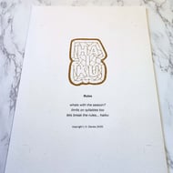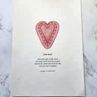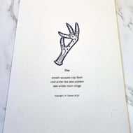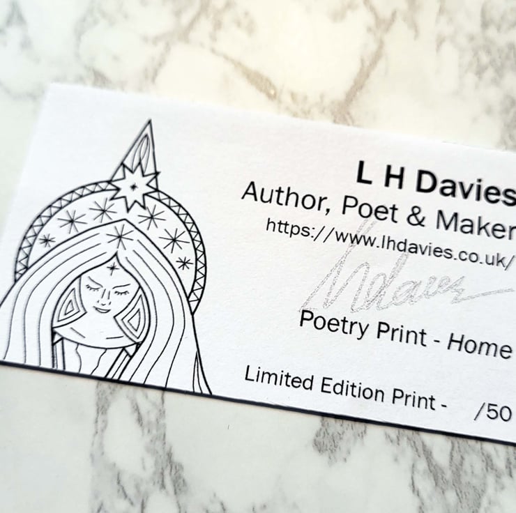 I am a poet/writer and a maker/artist so I have combined these to create limited edition poetical art prints that are printed digitally. Only 50, in this option, are available and each comes with a label stating the edition number.