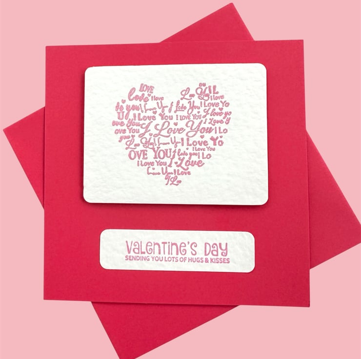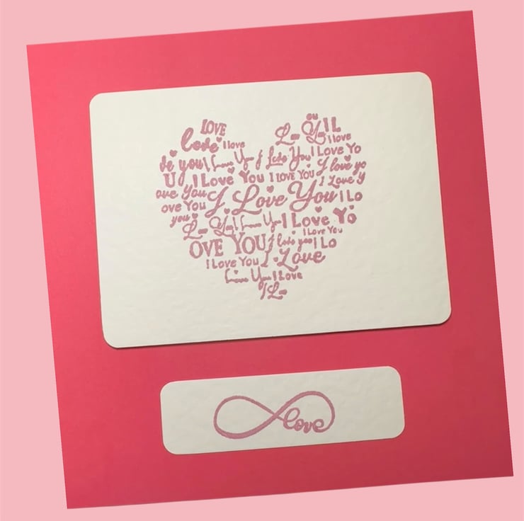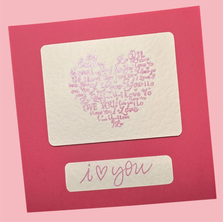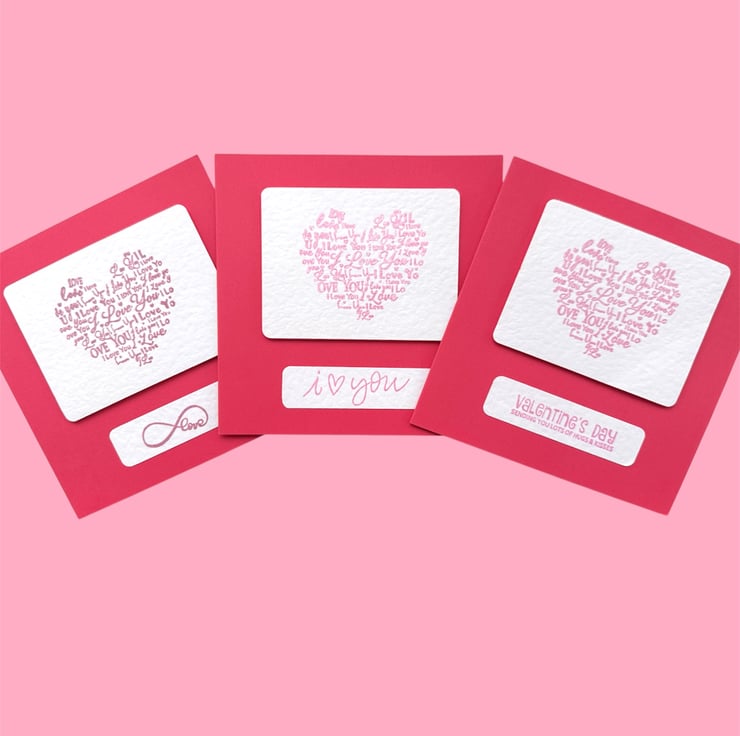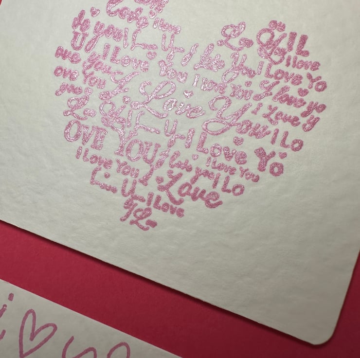 Each card is made on a heavy cerise pink base and features a heart design formed entirely from repeating “I love you” text in pearlescent pink ink.