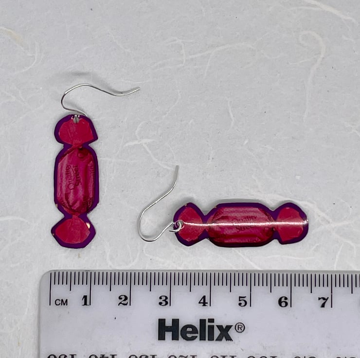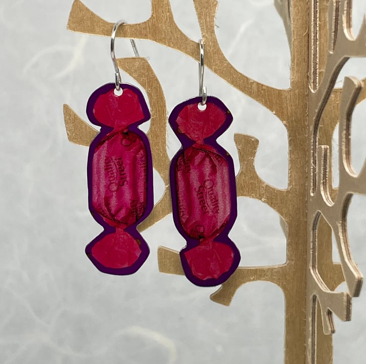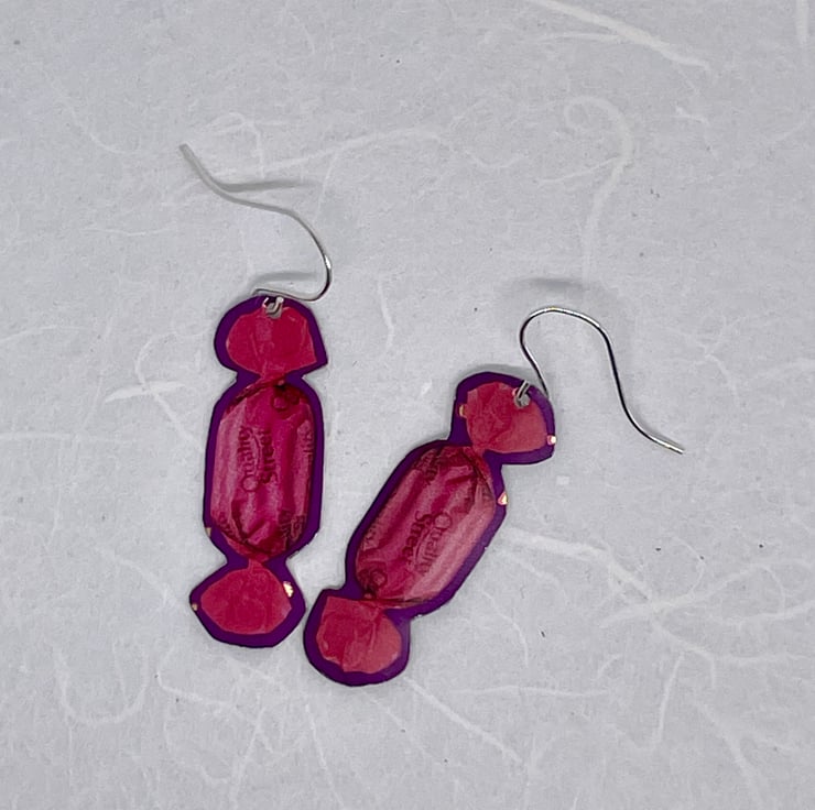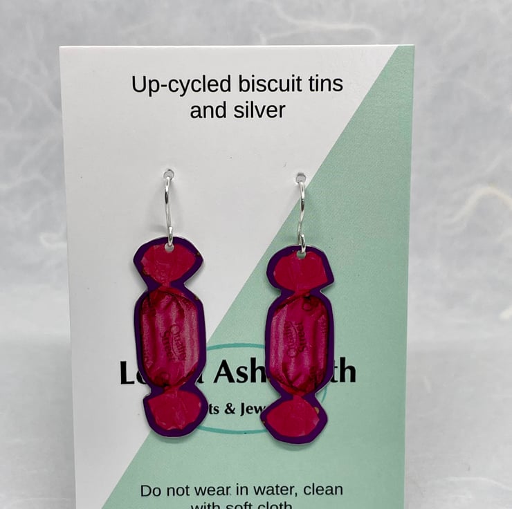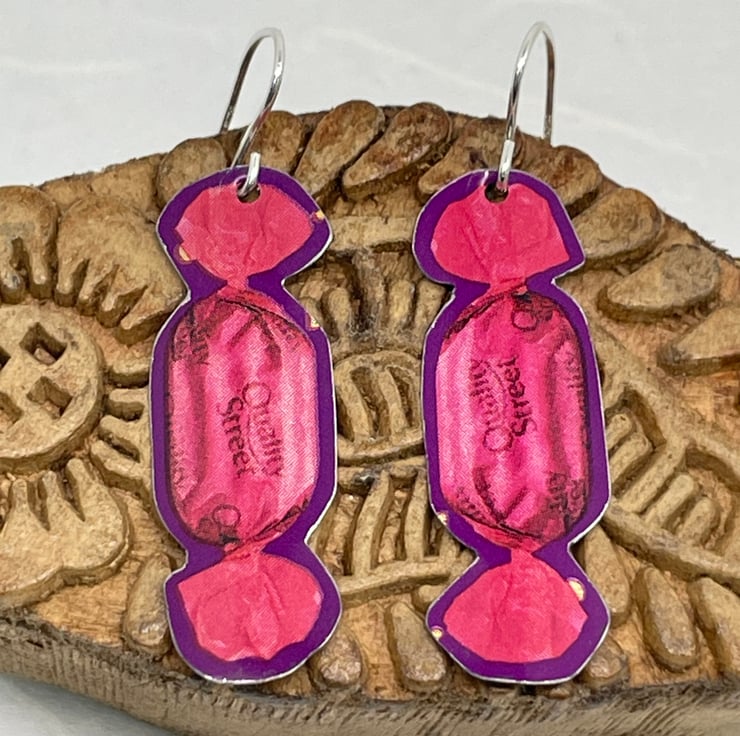 Fudge is the pink wrapper. These earrings are made from recycled Quality Street tins, they have a gentle curve so that they look nice when worn. They measure approximately 1cm wide and 4.5cm long.