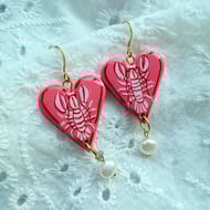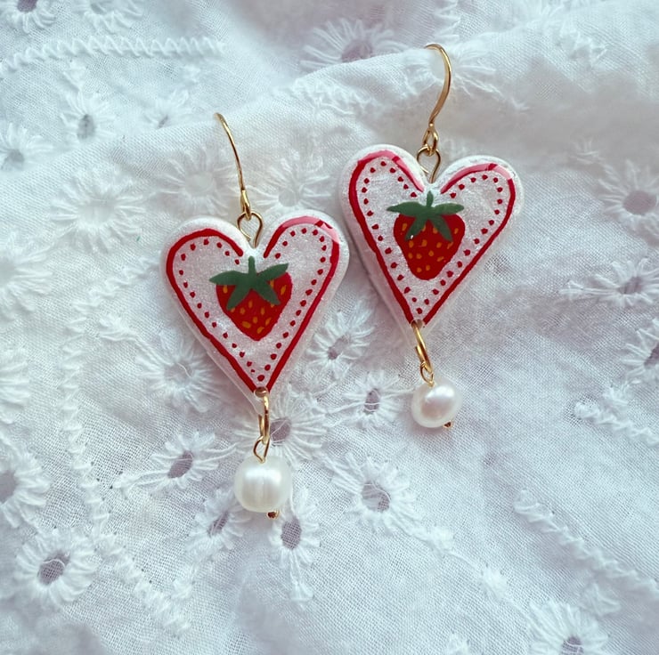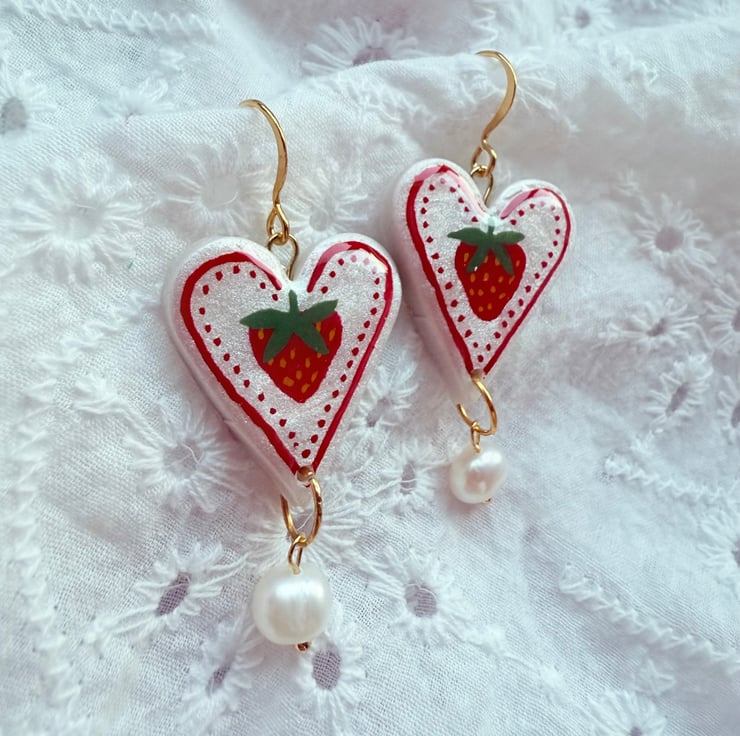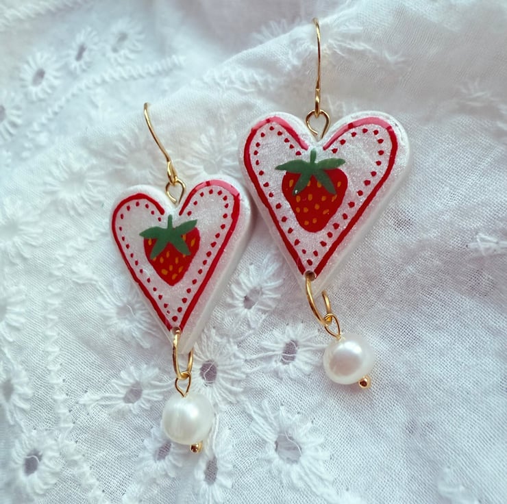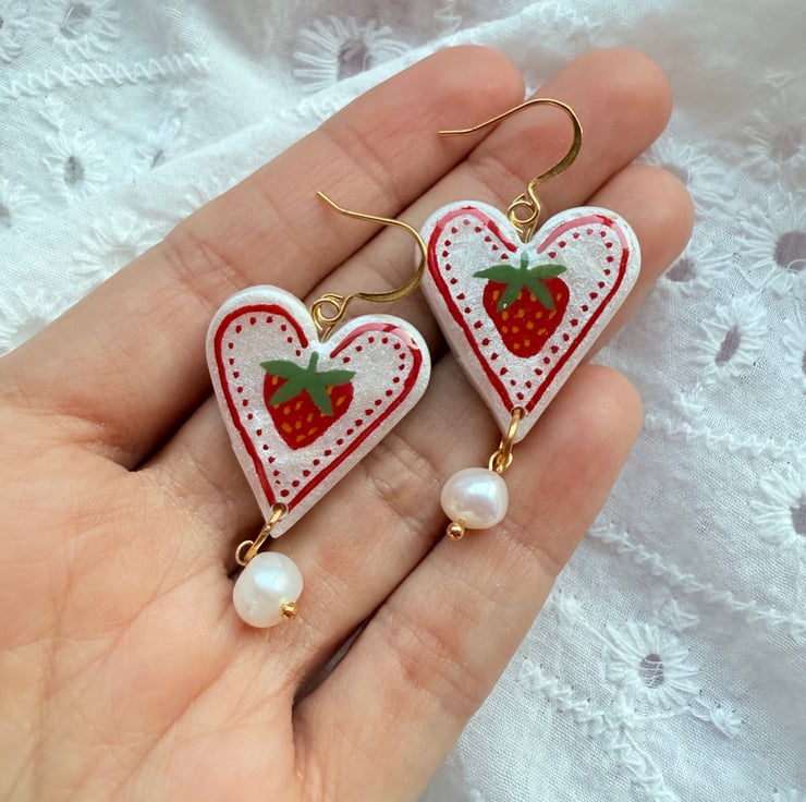 Each earring features a White shimmer heart-shaped polymer clay base, hand painted with a bright Red strawberry motif, delicate Red dotted detailing, and finished with a natural freshwater pearl drop. 18K Gold plated hooks add gentle movement, making them eye-catching yet easy to wear.
