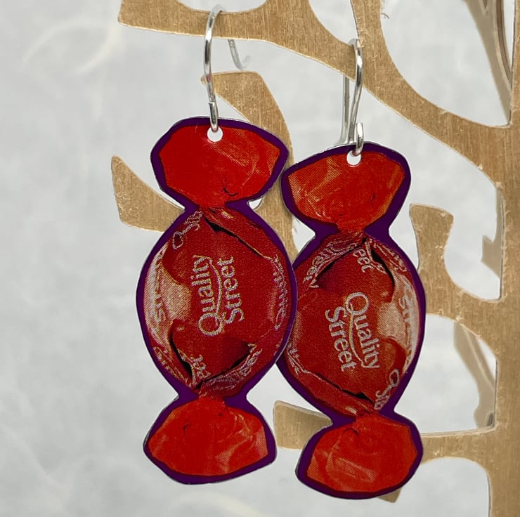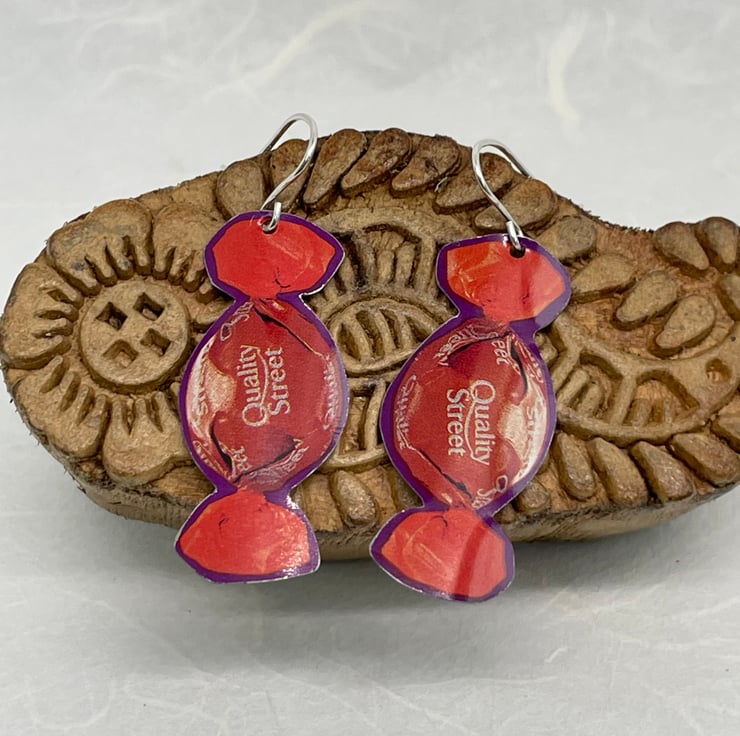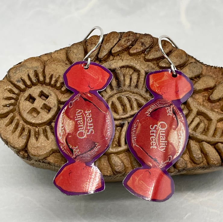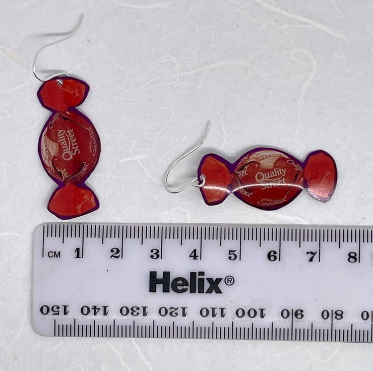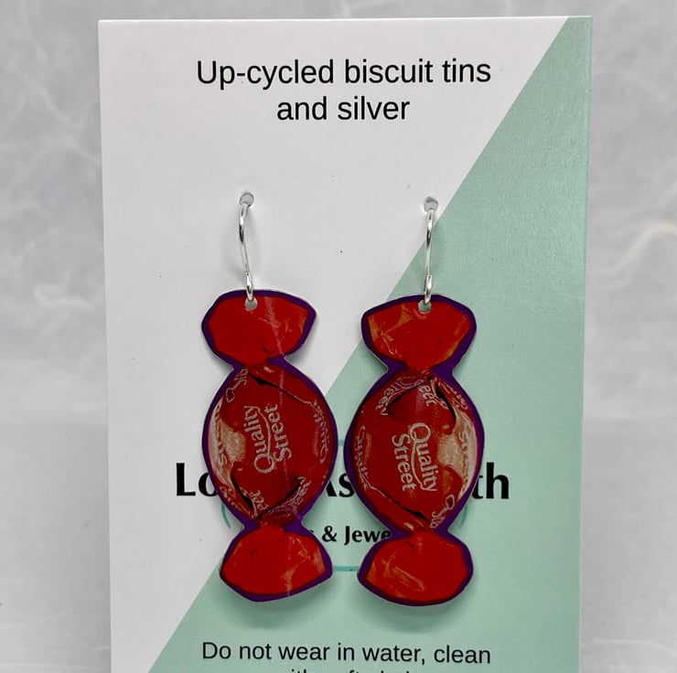 The Orange Chocolate Crunch anyone? This pair of earrings is made from recycling Quality Street tins, they are gently curved to give a nice look when wearing. These measure approximately 1.5cm wide and 4.5cm long.