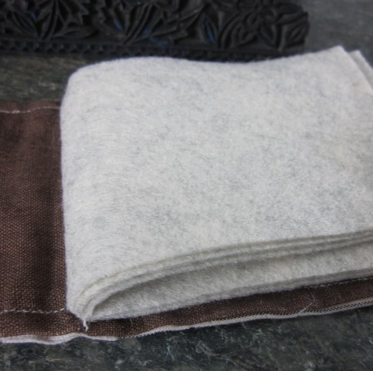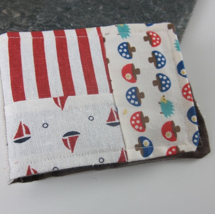 A cute cotton and linen needlebook, patterned with hedgehogs, mushrooms and sail boats. Backed with striped cotton/linen.