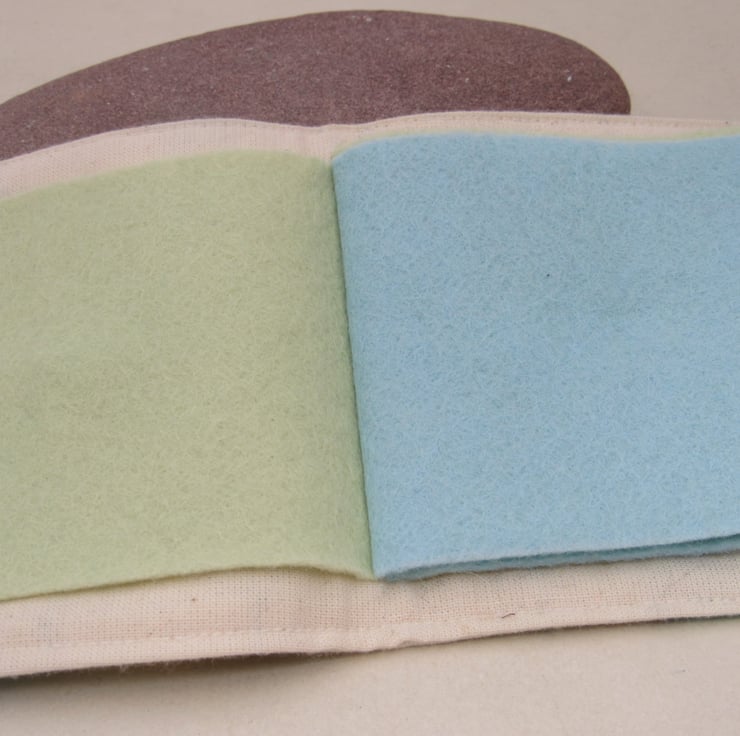 6 leaves of pale green and blue wool-blend felt to hold your needles, fastens with ribbon loop and button