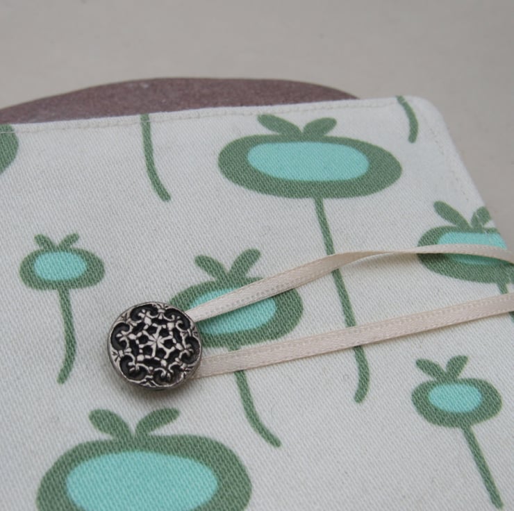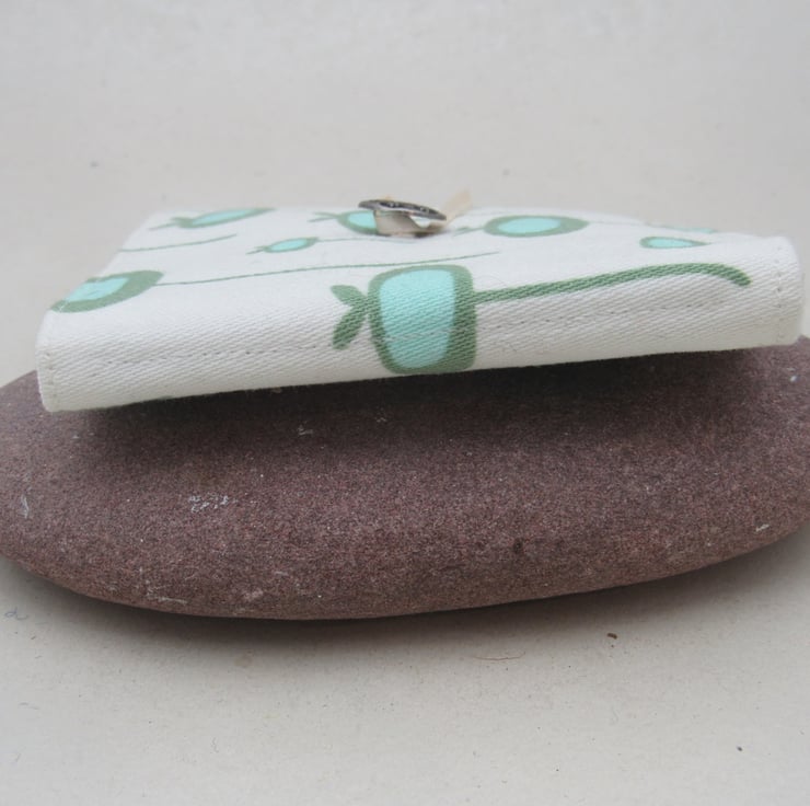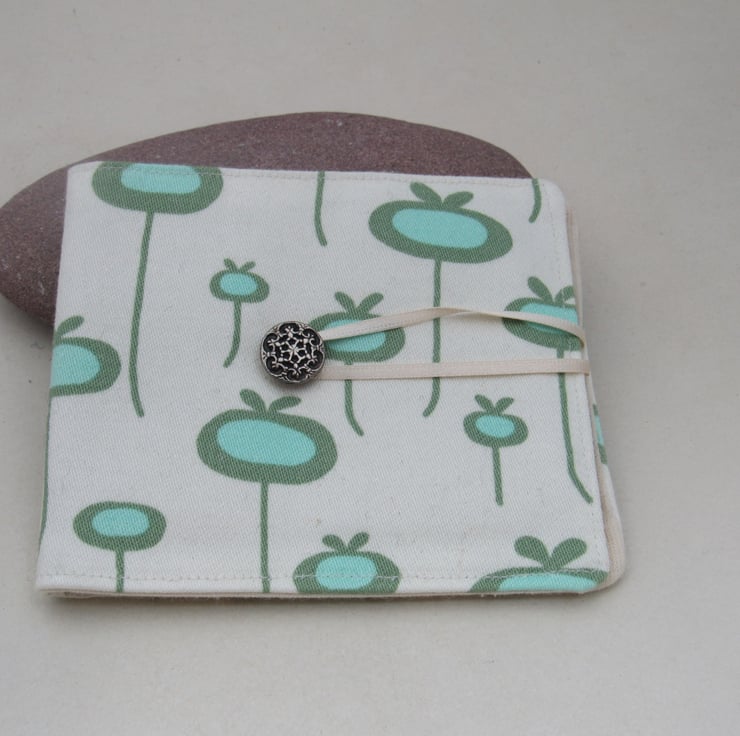 Rescued white cotton fabric with a pattern of aqua and blue poppy seedheads turned into a handy little needle organiser.
